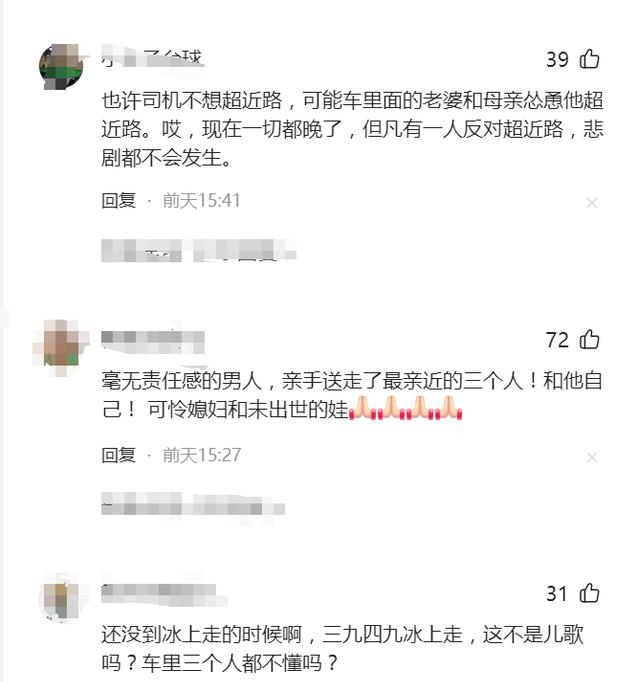 这场悲剧引发了网友的广泛讨论。有人将矛头指向司机任某,认为他作为一家之主和车辆驾驶员,理应对冰面的危险有所判断,而他选择冒险抄近道,显然是一个致命的错误。但也有网友表示,车内的其他人同样有责任。母亲和妻子为何没有劝阻?