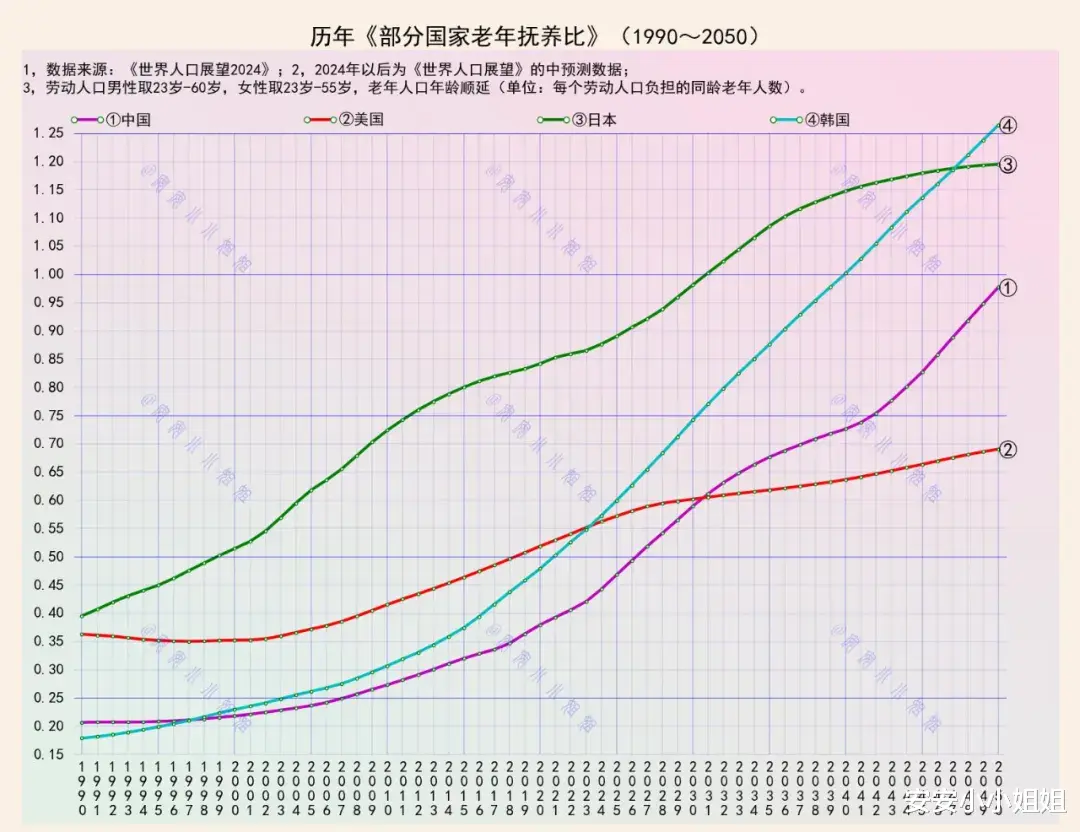 韩国的轨迹最为陡峭。1990年,其抚养比仅为0.15左右,是四国中养老压力最轻的。