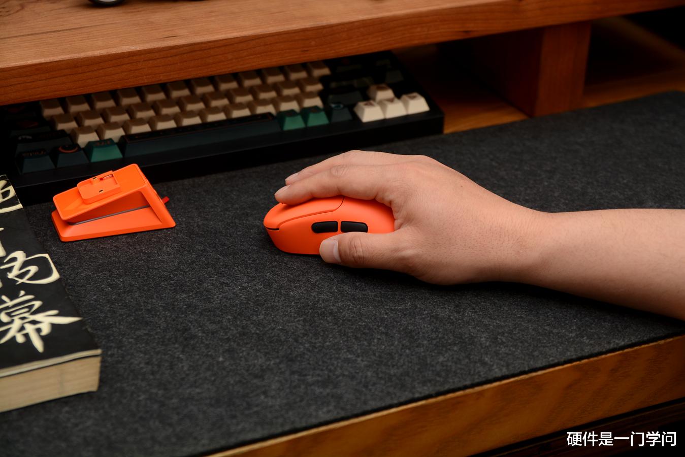 换成抓鼠姿势持握,食指中指点击部位正好在微动上方,点击时比较省力,大拇指放置在凹槽内,贴合鼠标侧裙。