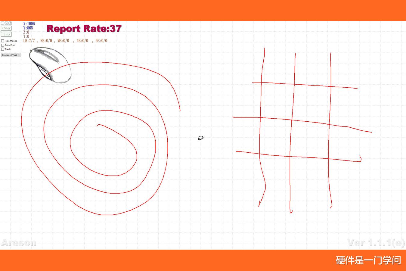 MouseTest软件画蚊香图和井字测试,鼠标垫为黑色CHERRY布垫,1600DPI,2.4G无线模式,8kHz回报率。关闭直线和波纹修正,快速、连续地划圈和井字。蚊香图线条连贯不丢帧,锯齿感不强,井字横线、竖线没有看到修正迹象。