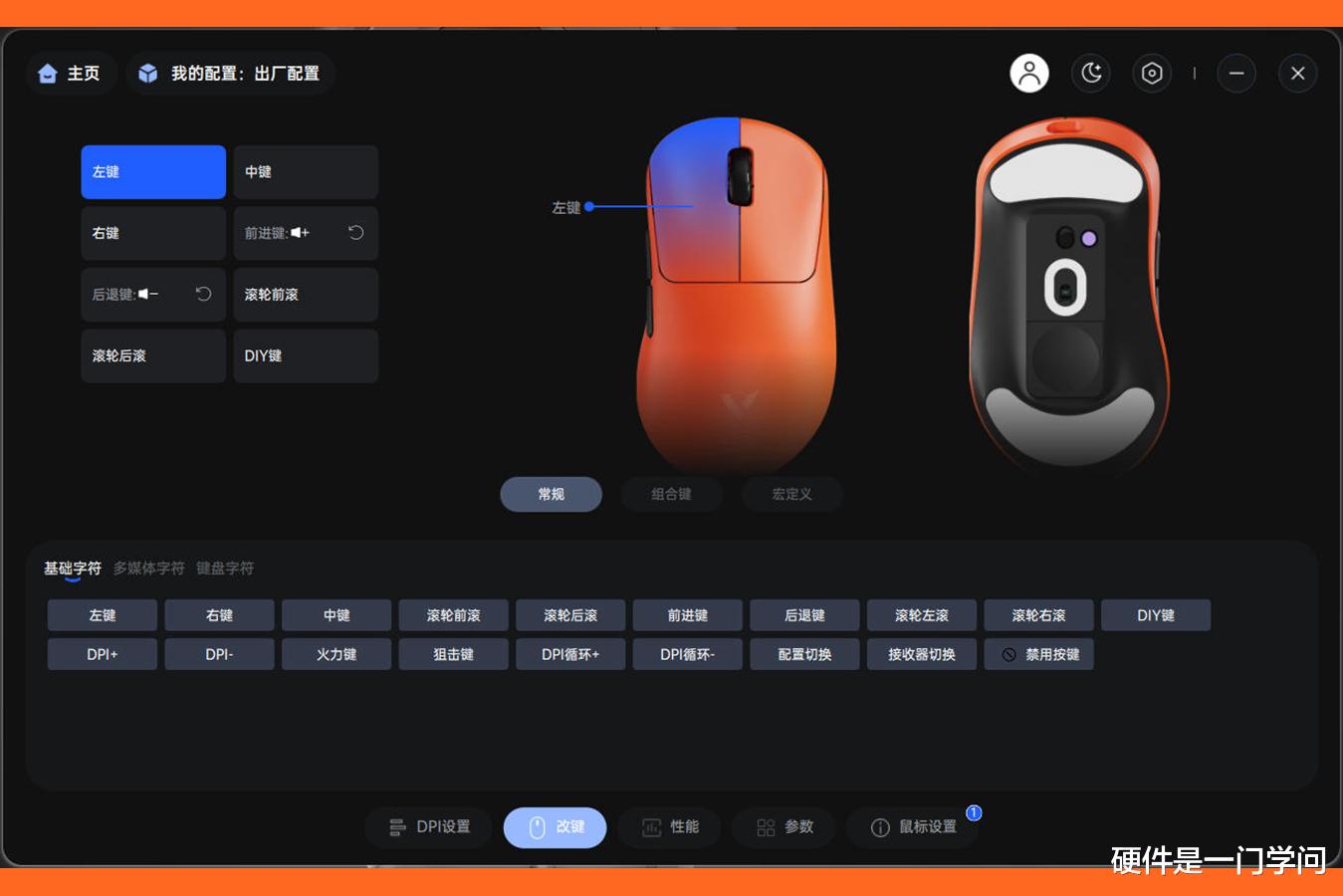 改键版块,可以对鼠标的右按键、滚轮、前进键、后退键和底部的DIY键进行个性化改键、组合键和宏定义设置,我一般将前进和后退键改成音量的增减键,方便影音和游戏时及时调整音量。