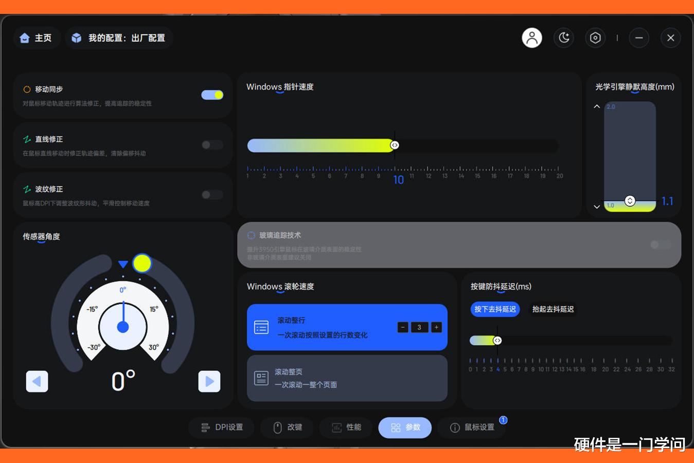 参数版块,可以打开或关闭直线修正、波纹修正、玻璃追踪,也可以对传感器角度进行设置。光学引擎静默高度,11档LOD静默高度可选,可以在1.0-2.0mm区间进行精细化设置。按键防抖延迟,可以对按下去抖延迟和抬起去抖延迟0-32ms区间进行设置。