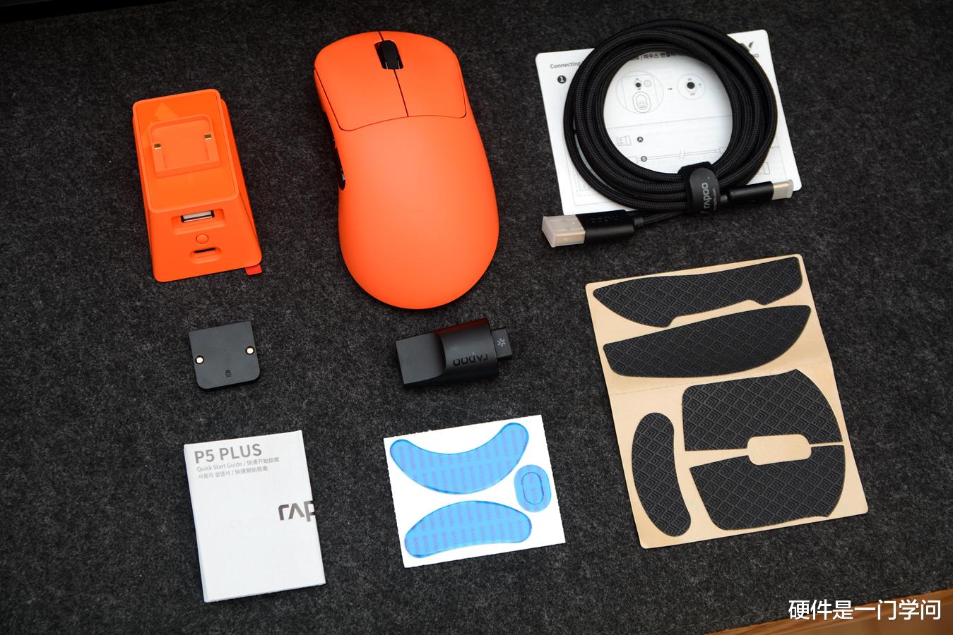 VT3s包装内有鼠标、USB转接器、8K接收器、8K带屏蔽高速编织线、"冰感"PTFE特氟龙高含量电竞大脚垫、大全套防滑贴和产品说明书,P5 PLUS包装内有磁吸触点充电底座、橙色充电模块、黑色充电模块和产品说明书。为了提升抗干扰性能,线材增加了屏蔽层,因此材质比较硬,理线时比伞绳线材要难一些。
