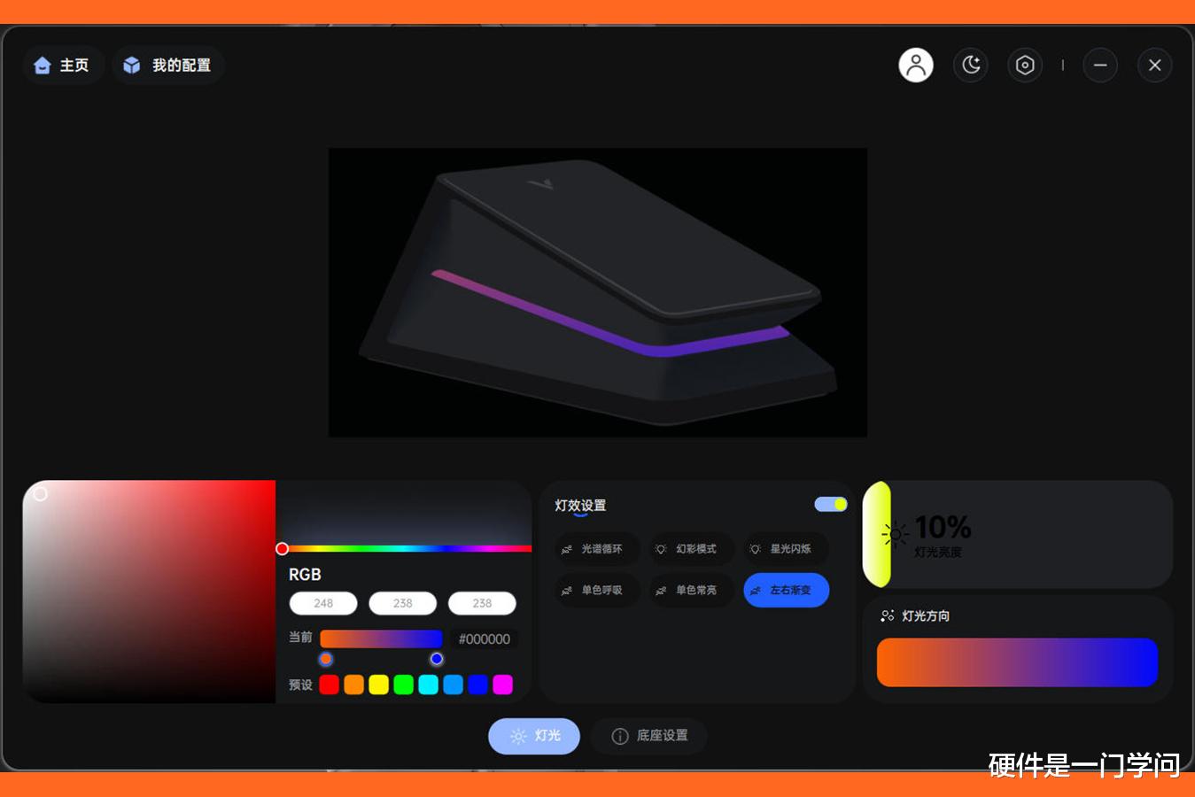 雷柏A-Hub驱动分为网页端和本地APP端,玩家按需选择。有线或无线连接后,P5 PLUS和VT3s均自动识别。P5 PLUS可以对灯带进行设置,内置光谱循环、幻彩模式、星光闪烁、单色呼吸、单色常亮、左右渐变6种灯效,支持自定义RGB色,以及灯光亮度和方向,个人觉得10%亮度就足够亮了。