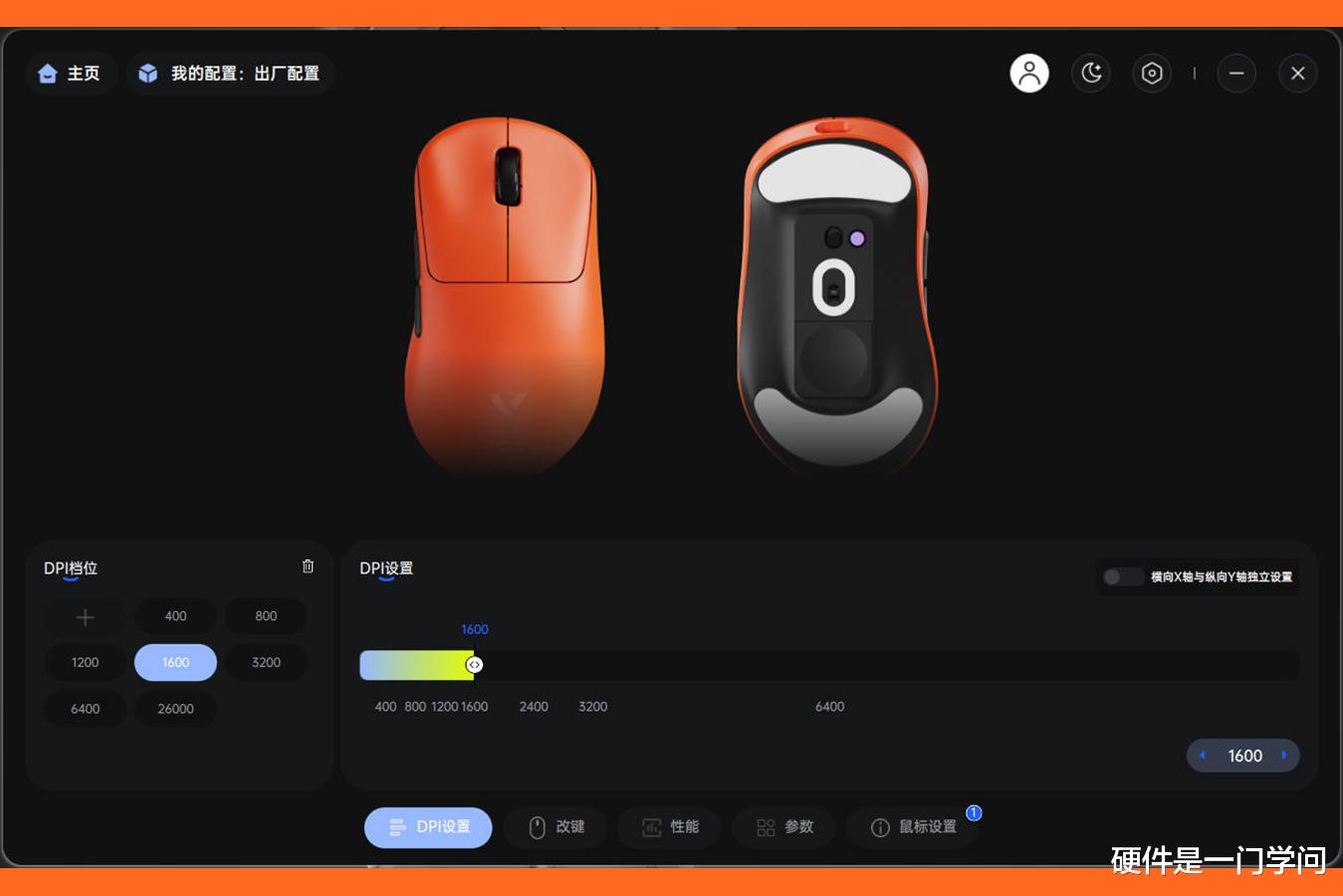 VT3s驱动分为DPI设置、改键、性能、参数、鼠标设置5个版块,DPI可在50-26000数值间设置,50步进,内置400、800、1200、1600、3200、6400、26000七档DPI值,默认1600DPI。