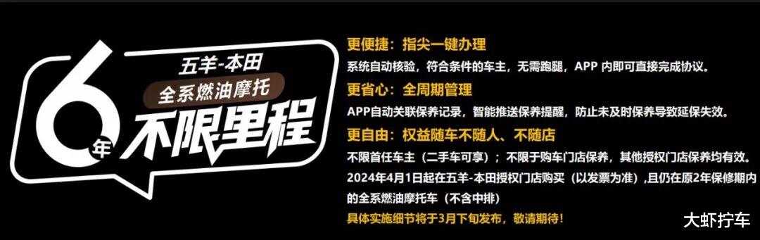 更重要的是第三点更自由,一般来说新车售后服务对象都是新车的首任车主,而五羊-本田此次将服务对象扩展到了从2024年4月1日期后包含购入二手车在内的所有车主,也就是说如果小编今天在小黄鱼上买了一辆2024年4月以后购入的二手五羊本田NPF125,无论这台车是不是被前任外卖送餐小哥任劳任怨的送餐20万公里,也无论是在我将这台小车从广东骑到拉萨一路上的哪一个五羊-本田授权经销商门店,五羊-本田都将为我提供从第一任车主购车之日后六年的保修售后服务。官方提供的这条背书无疑将大大提升五羊-本田旗下燃油车型的二手折旧率和交易量。