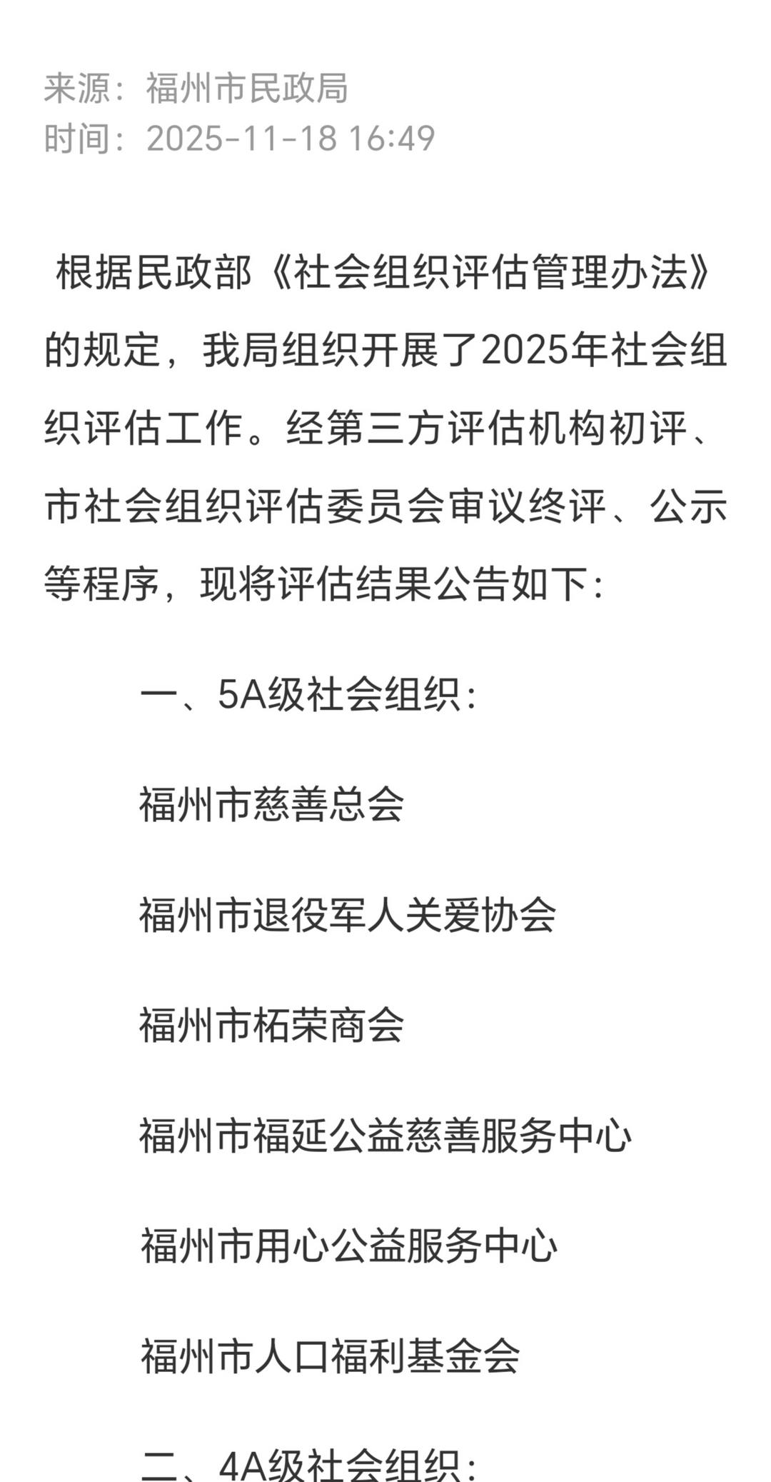 近日,福州市民政局正式发布2025年社会组织评估结果公告,福州市福延公益慈善服务中心凭借扎实的公益实践获评AAAAA级(慈善类社会组织 )。