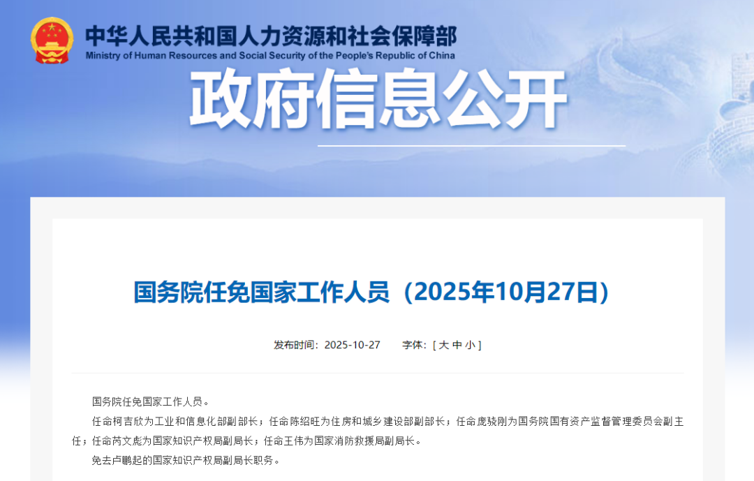 据人力资源和社会保障部网站10月27日消息,国务院任免国家工作人员:任命柯吉欣为工业和信息化部副部长。
