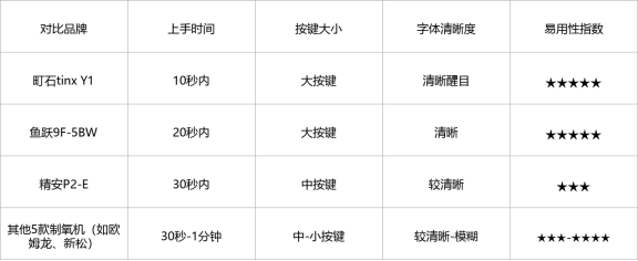 测评方法:邀请3位55-65岁的中老年朋友,不经过指导,直接操作8款制氧机,记录上手时间、操作流畅度,观察按键大小、字体清晰度,测试是否能独立完成开机、调档、关机等基础操作。