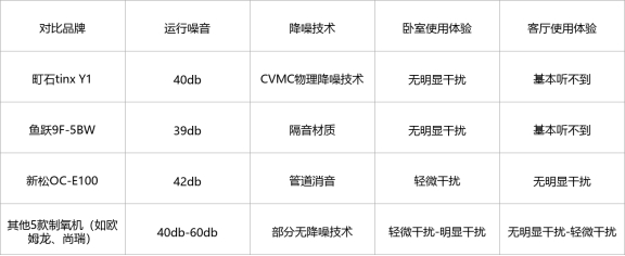 第一梯队的新松OC-E100,运行噪音42db,有轻微干扰,尤其是在卧室使用时,能听到轻微的噪音,但不影响正常休息,它采用管道消音技术,噪音控制得也还可以,但不如町石安静。