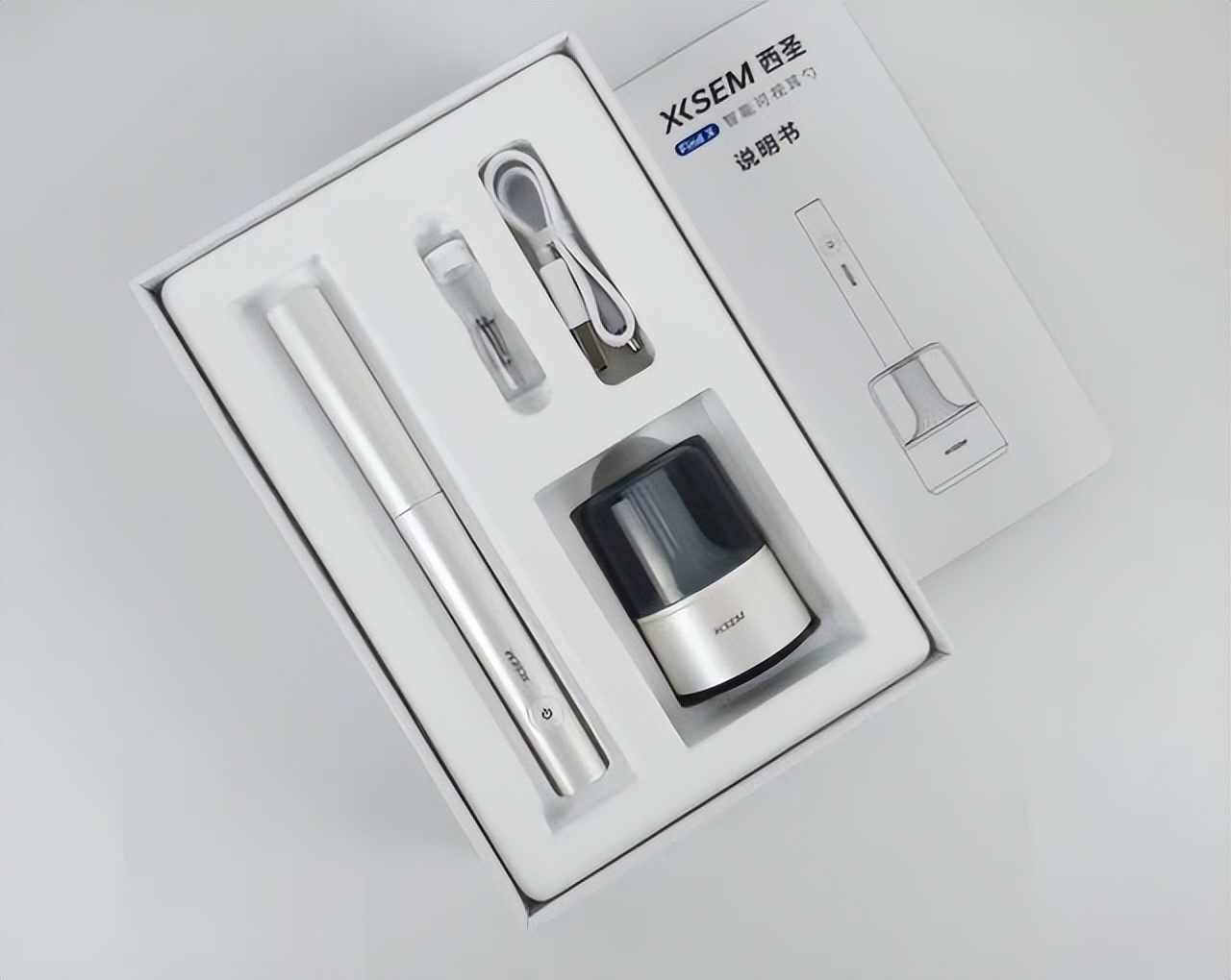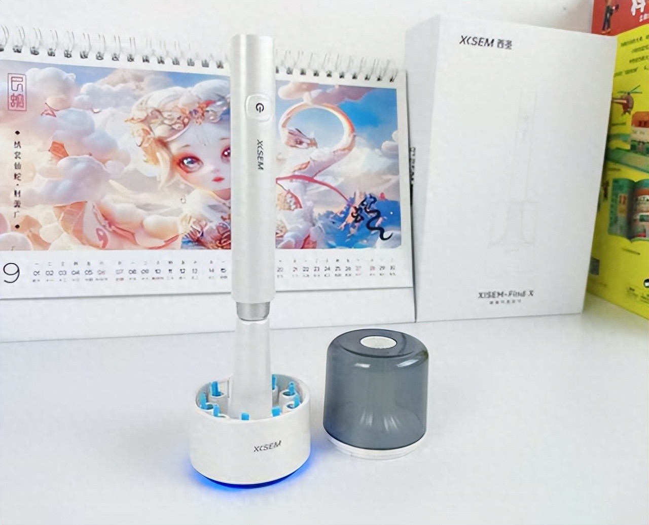 打开盒盖,所有配件分列排排坐:主机、消毒底座、充电线,还有耳铲头、耳钩头,连 8 个可替换硅胶套都给你细致分类。不得不赞叹,西圣对于细节的把控有着严谨的态度。