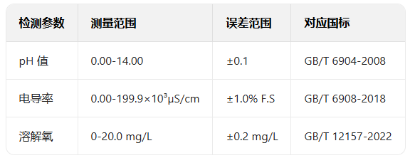 多参数集成:覆盖 pH、电导率、溶解氧三大核心指标,还集成浊度、硬度、全碱度等 11 项参数,完全满足GB/T 1576-2018全部要求;