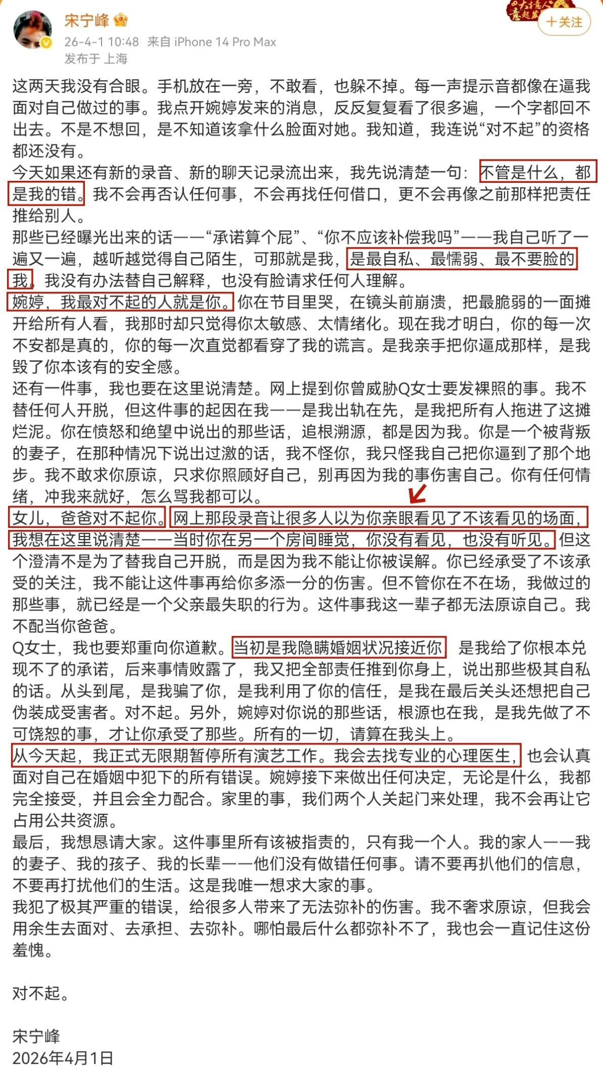 在舆论发酵后,宋宁峰火速回应,发长文承认了自己出轨的事实。