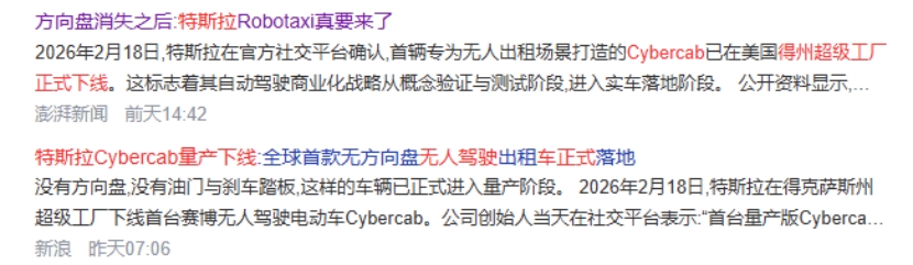 2月18日,特斯拉在官方社交平台确认,首辆专为无人出租场景打造的Cybercab已在美国得州超级工厂正式下线。这标志着其自动驾驶商业化战略从概念验证与测试阶段,进入实车落地阶段。