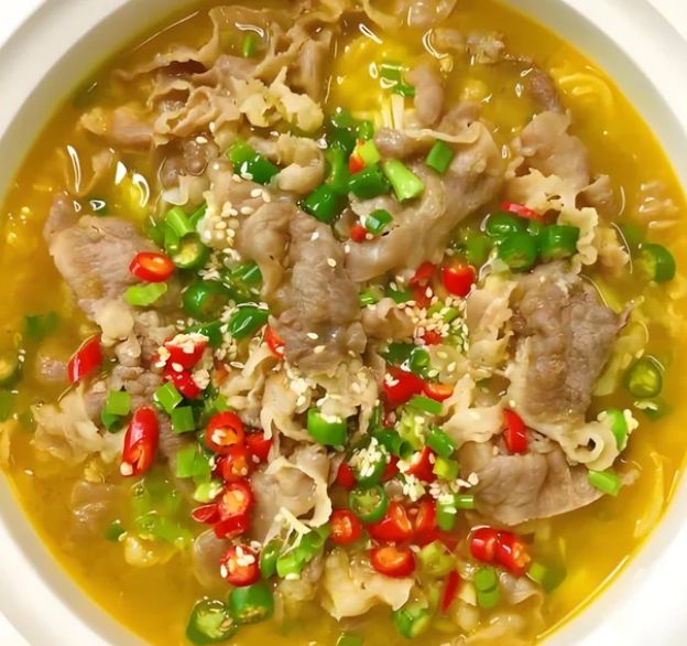 把准备好的蔬菜放进去烫熟,捞出来铺在大碗底部。接着把肥牛片一片片放入汤中,用筷子拨散,看到变色卷曲就立刻关火,煮久了肉会老。连汤带肉一起倒进碗里,撒上青红椒圈和蒜末,最后烧一点热油浇上去,“滋啦”一声,香味就全出来了。