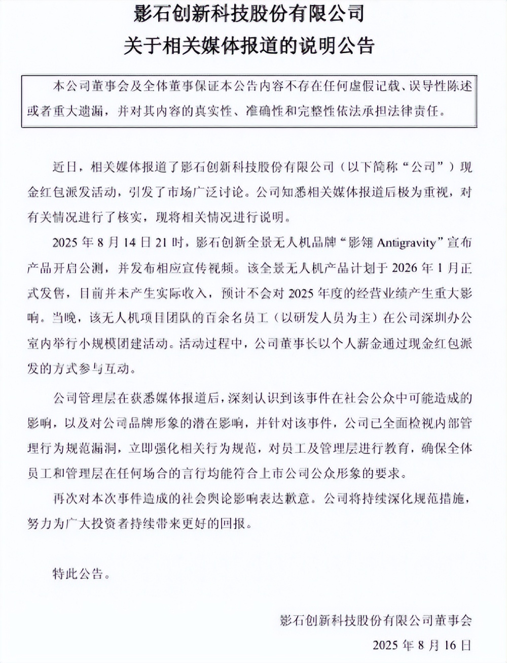 在意识到这一问题后,影石董事会迅速发布公告来“灭火”,在还原事情来龙去脉之余,重点进行道歉、反思。