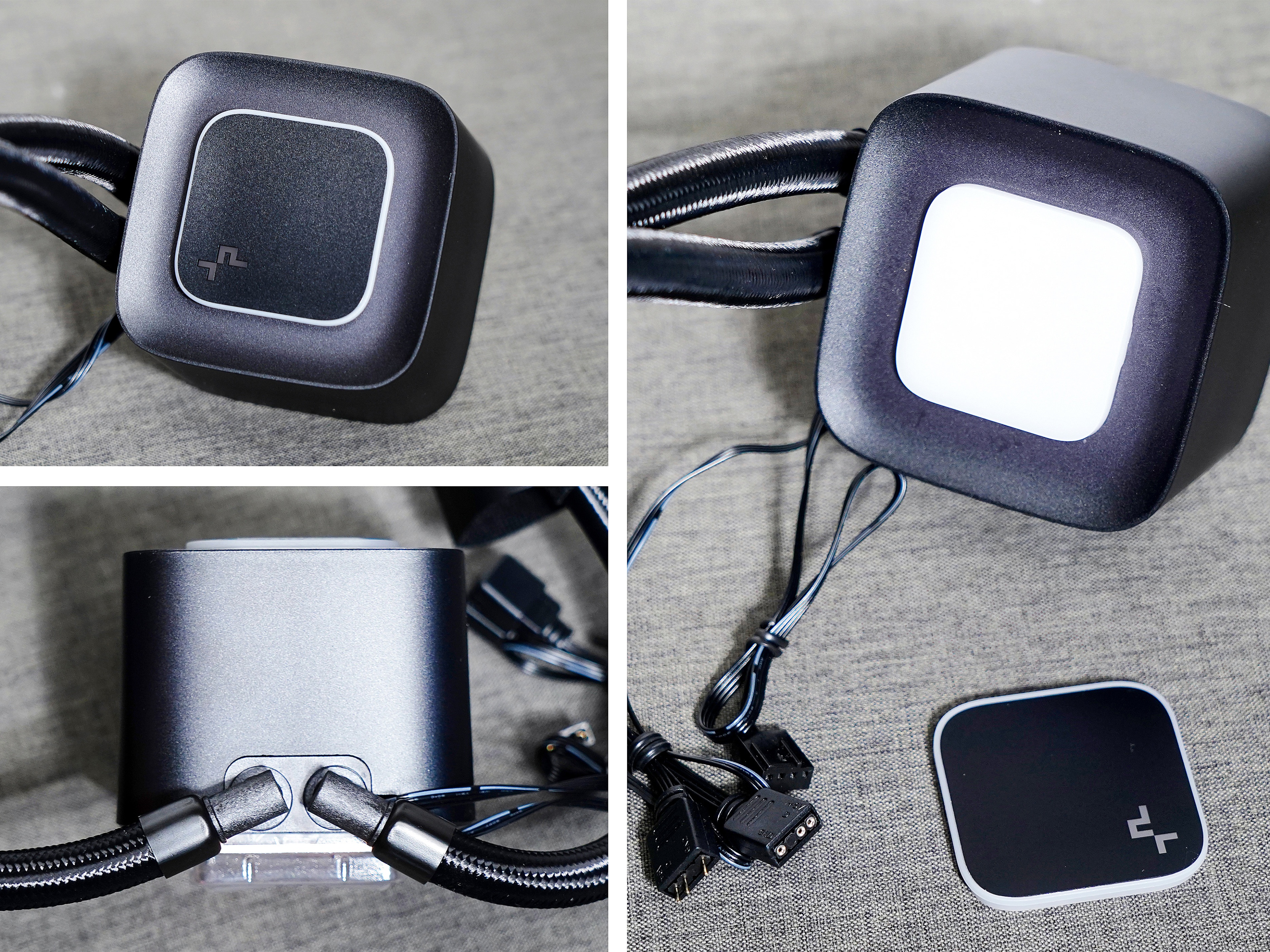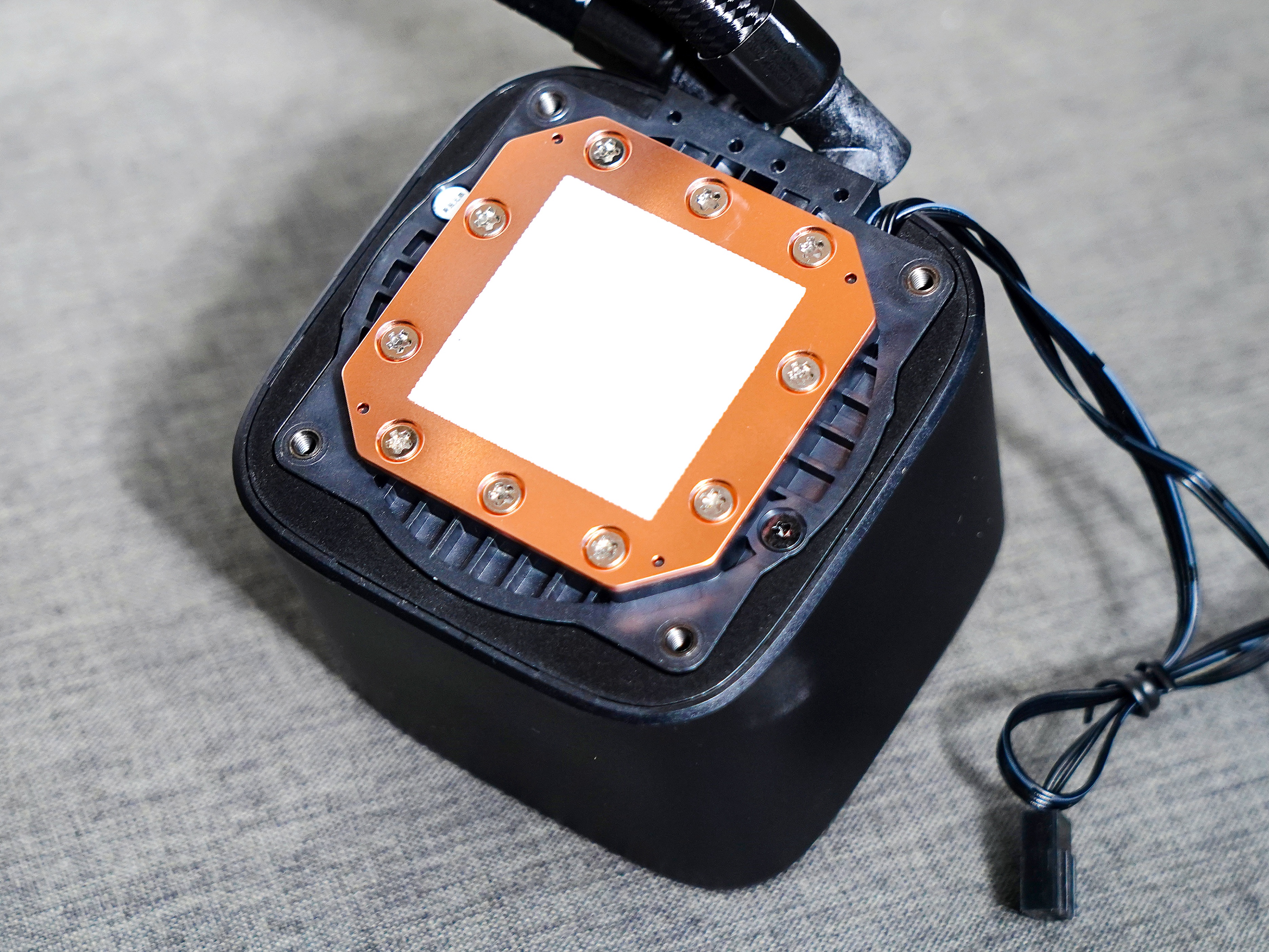▼水冷头高度为65mm,方型,不过边缘倒角弧度很大,显得圆润可爱,表面经过磨砂处理,并且有一定的透光性。带有九州图形logo的顶盖能拆下,可以改变角度以适用不同的装机方向。内部采用了3相6槽4极电机水泵,转速2500~3400 RPM,并支持4Pin PWM智能调速。