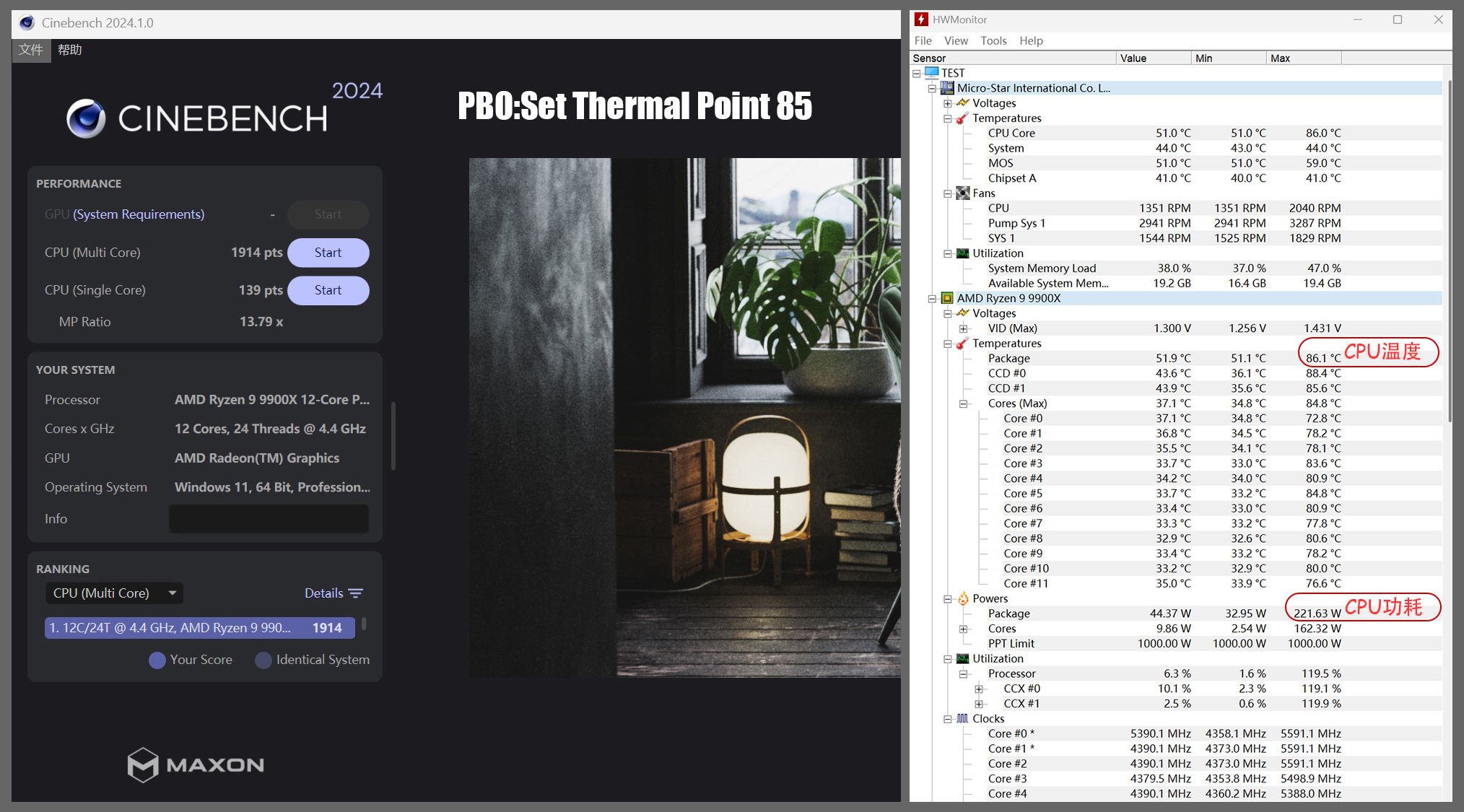 ▼这种情况下建议使用设置温度墙的方式(Set Thermal Point模式)。把最高温度墙设置成85°C,再次进行CineBench R24测试,多核得分为1914,居然比PBO Advanced的分数还高了一丢丢,但最高温度只有86°C。