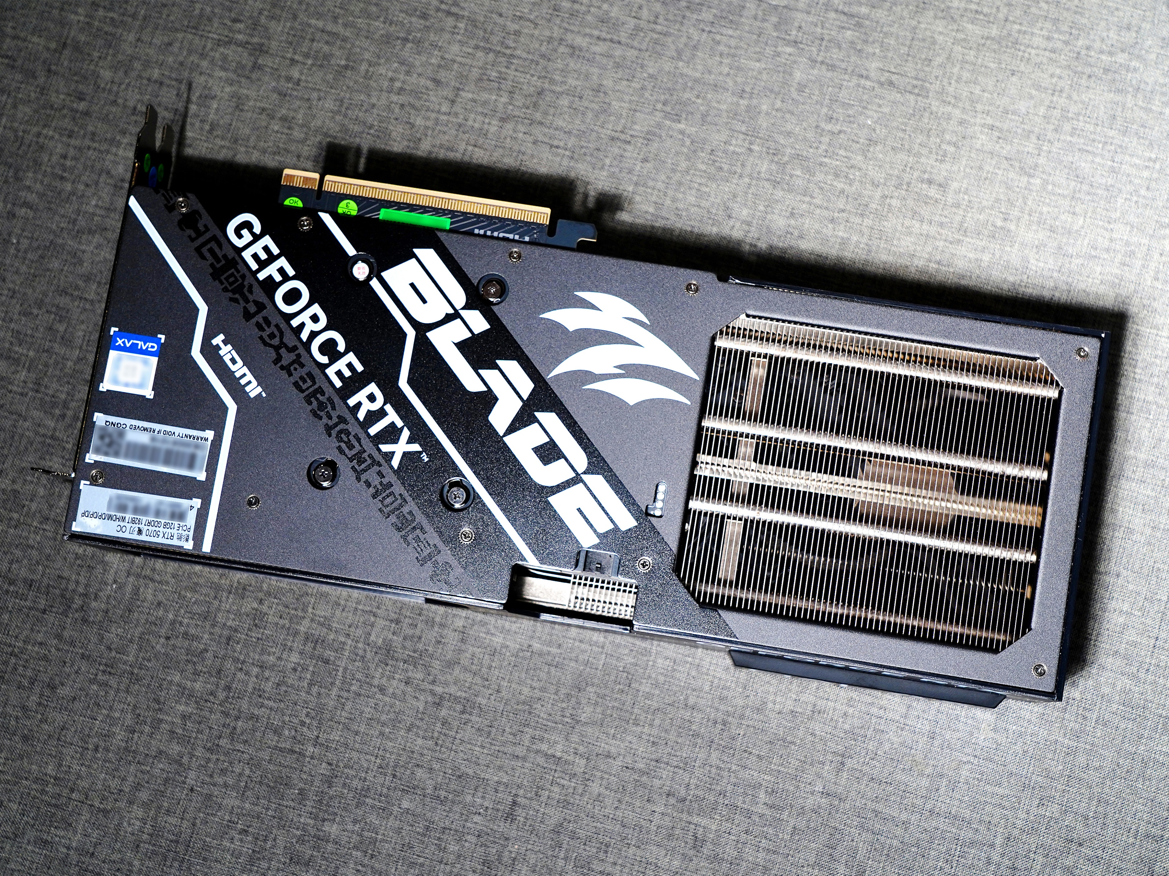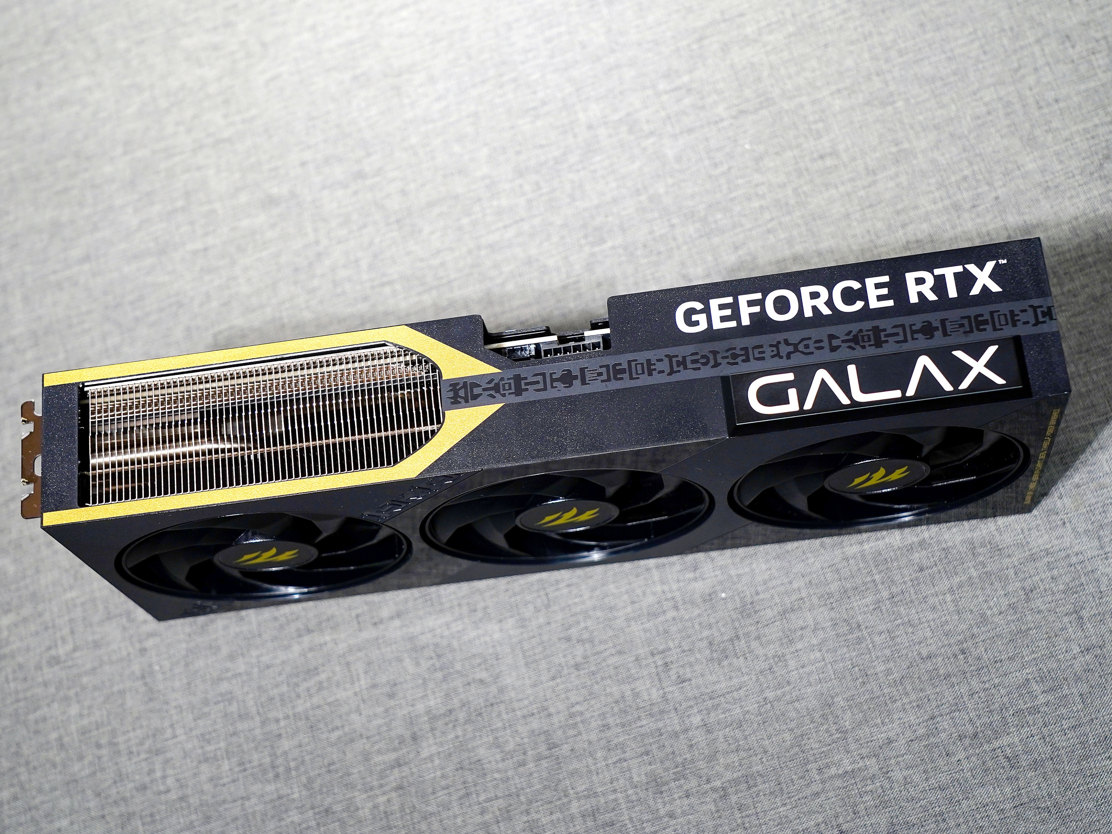 ▼显卡厚度为50mm,大概为两槽半。外侧中间部分也有符文加持,将“RTX”和“GALAX”的logo分成了两部分。