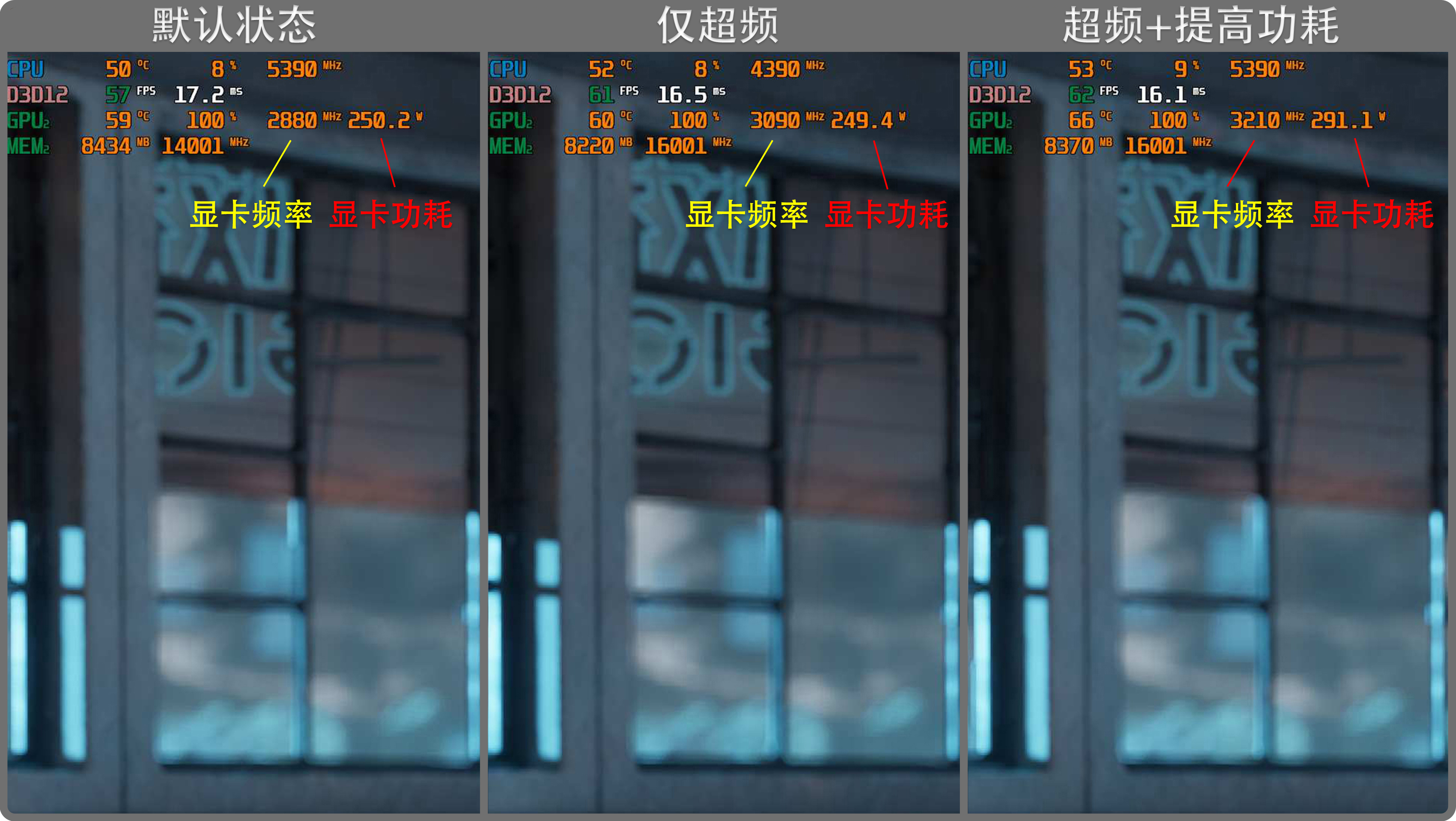 ▼截取Speed Way大致相同帧的画面,可以看到超频并提高功耗的显卡频率最高,但功耗也是增至接近300w,并且温度也会高了一些。