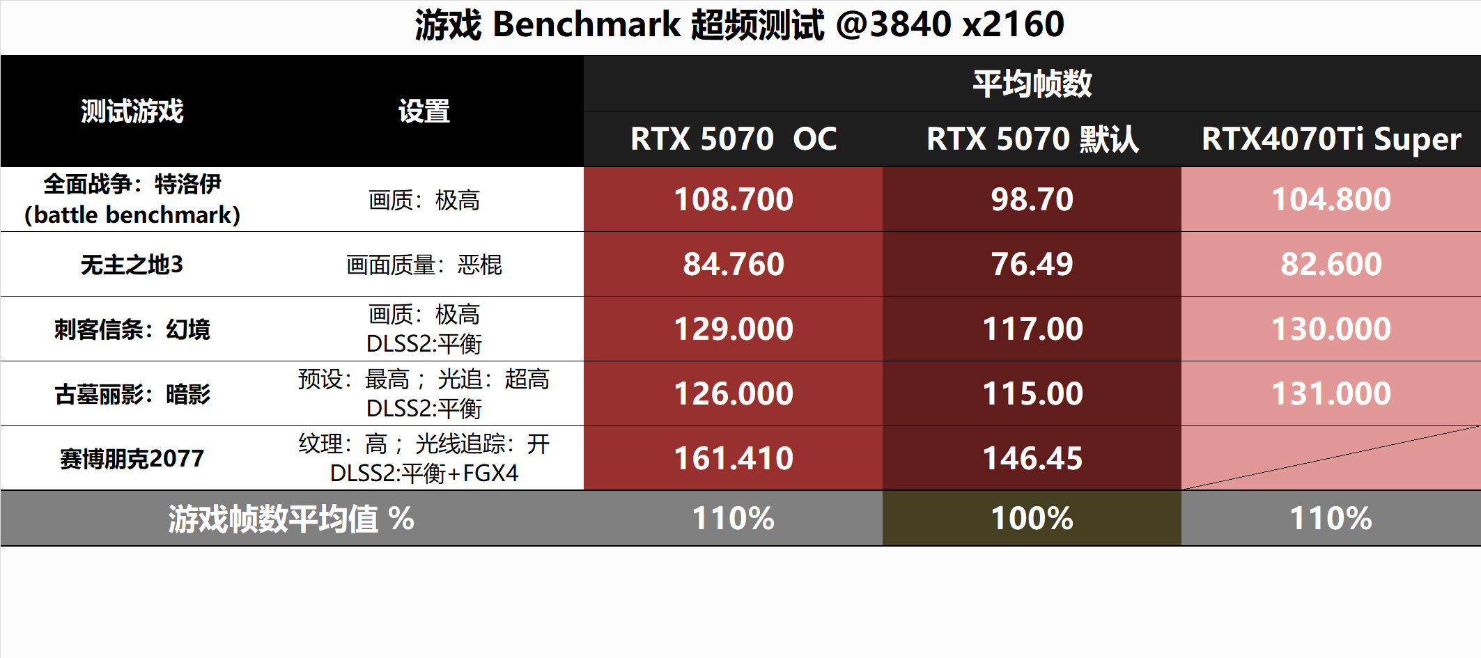 ▼再来看看实际的游戏性能,4k分辨率,测试了5款游戏,平均下来超频后性能提高了~10%(超频并提高功耗)。这样基本就和RTX4070Ti super持平了。如果在意功耗和温度,也可以采用不提高功耗的超频方式,性能可以提高7~8%,显然更有性能比。由于RTX50超频太过轻松,可以说是白送你的!