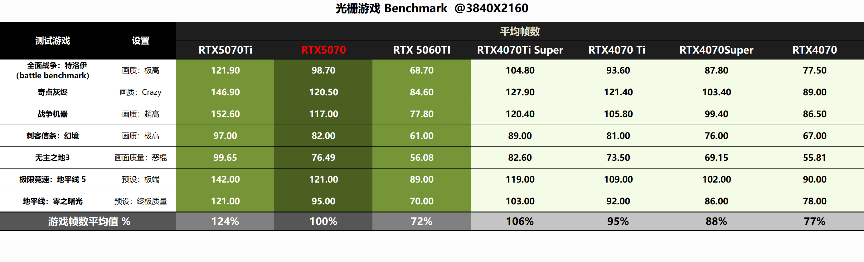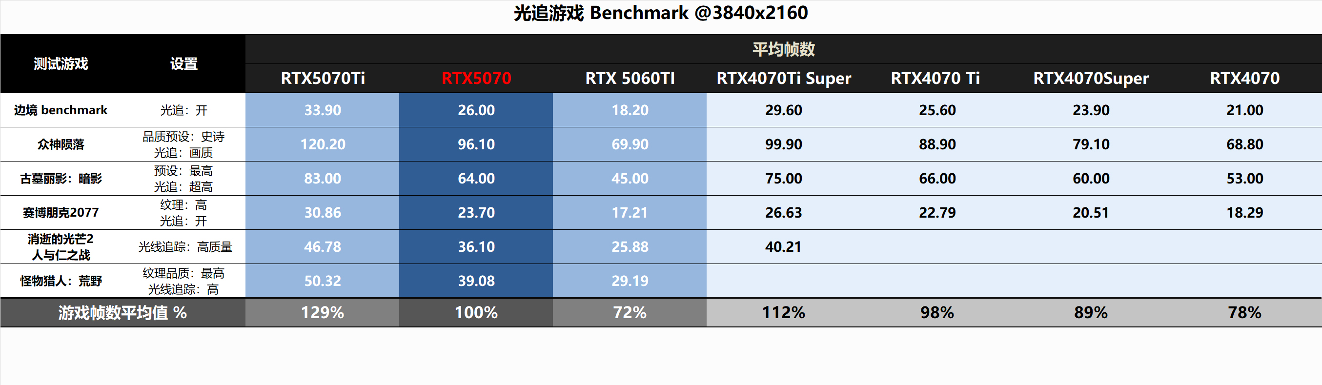 ▼4k分辨率,RTX5070领先RTX5060Ti(16GB)为28%,落后RTX5070Ti 为24%;领先了RTX4070为23%,小胜RTX4070Ti,落后RTX4070Ti super达6%。对于传统光栅游戏,4k分辨率很多游戏都超过百帧,没啥不能玩的。