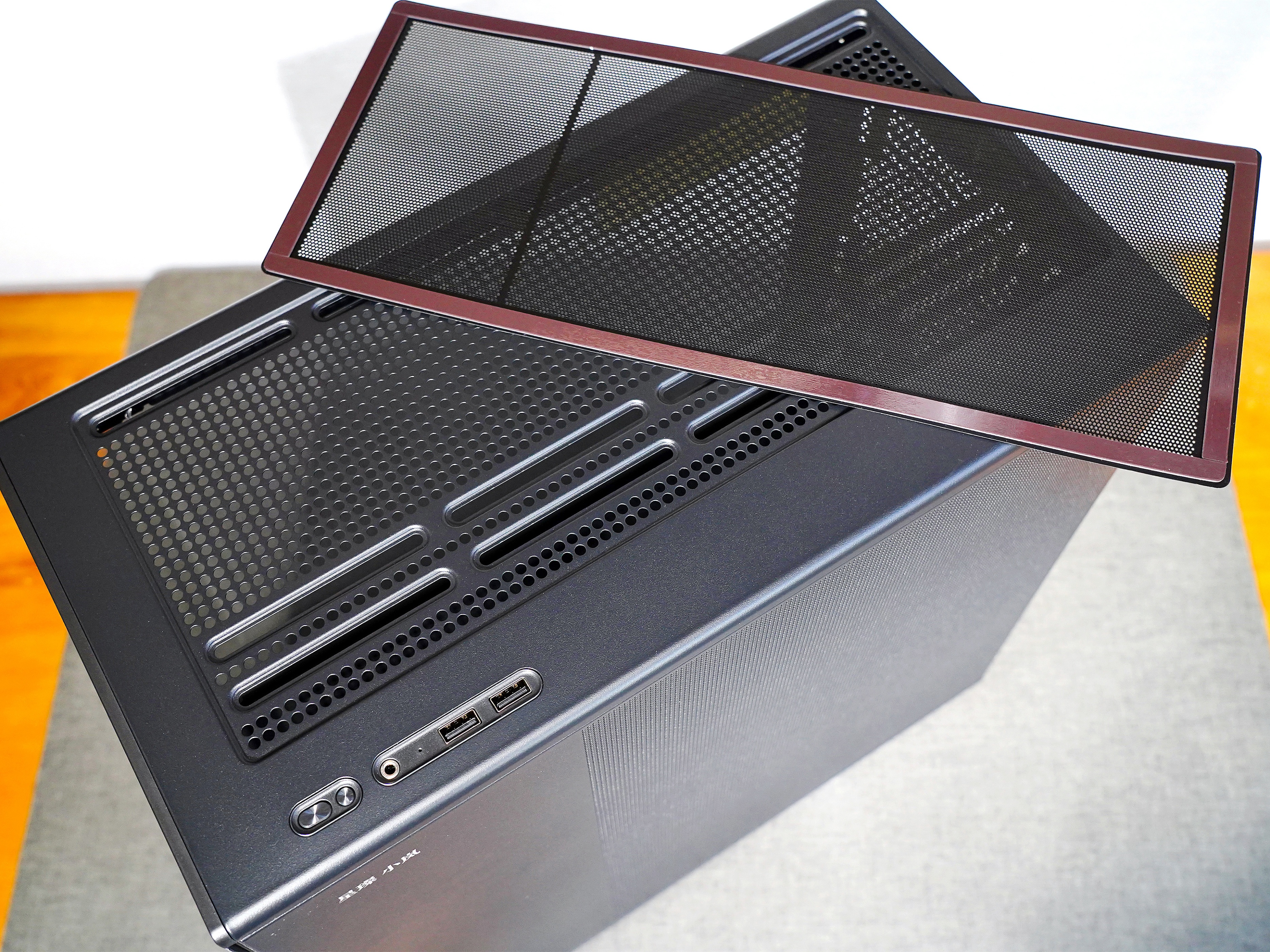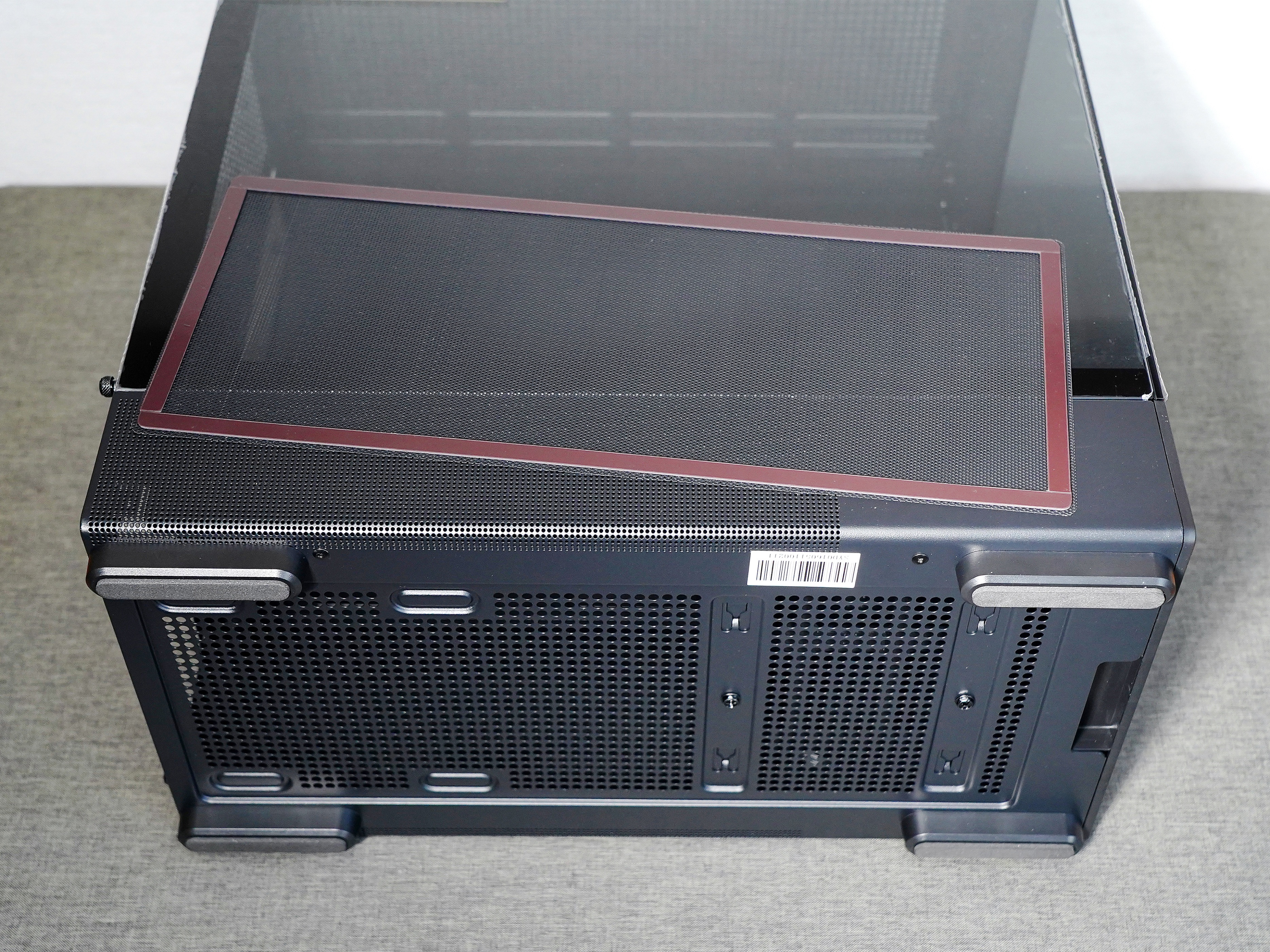 ▼顶部为大面积mesh网设计,带有磁吸防尘网,支持最大240mm规格冷排,或者3个120mm/2个140mm风扇的安装。I/O面板在顶部的右前侧,提供了2个Type-A USB3.0、1个二合一音频接口,重启键和电源键。2025年了,没有Type-C接口确实不太方便。