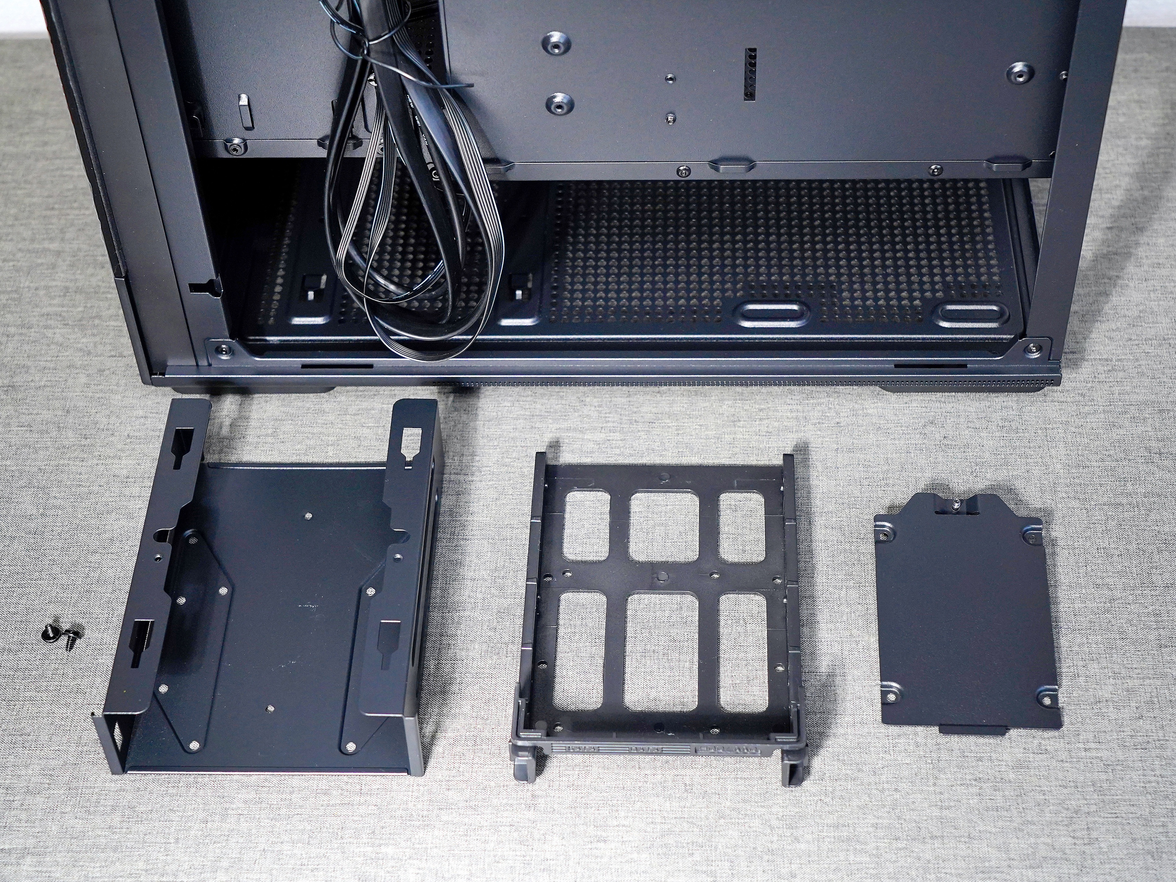 ▼机箱内的硬盘笼可以取下,能安装2块3.5寸硬盘,并兼容2.5寸硬盘,另外还有一个壁挂式的2.5寸硬盘架。支持ATX电源,兼容长度为230mm以内。