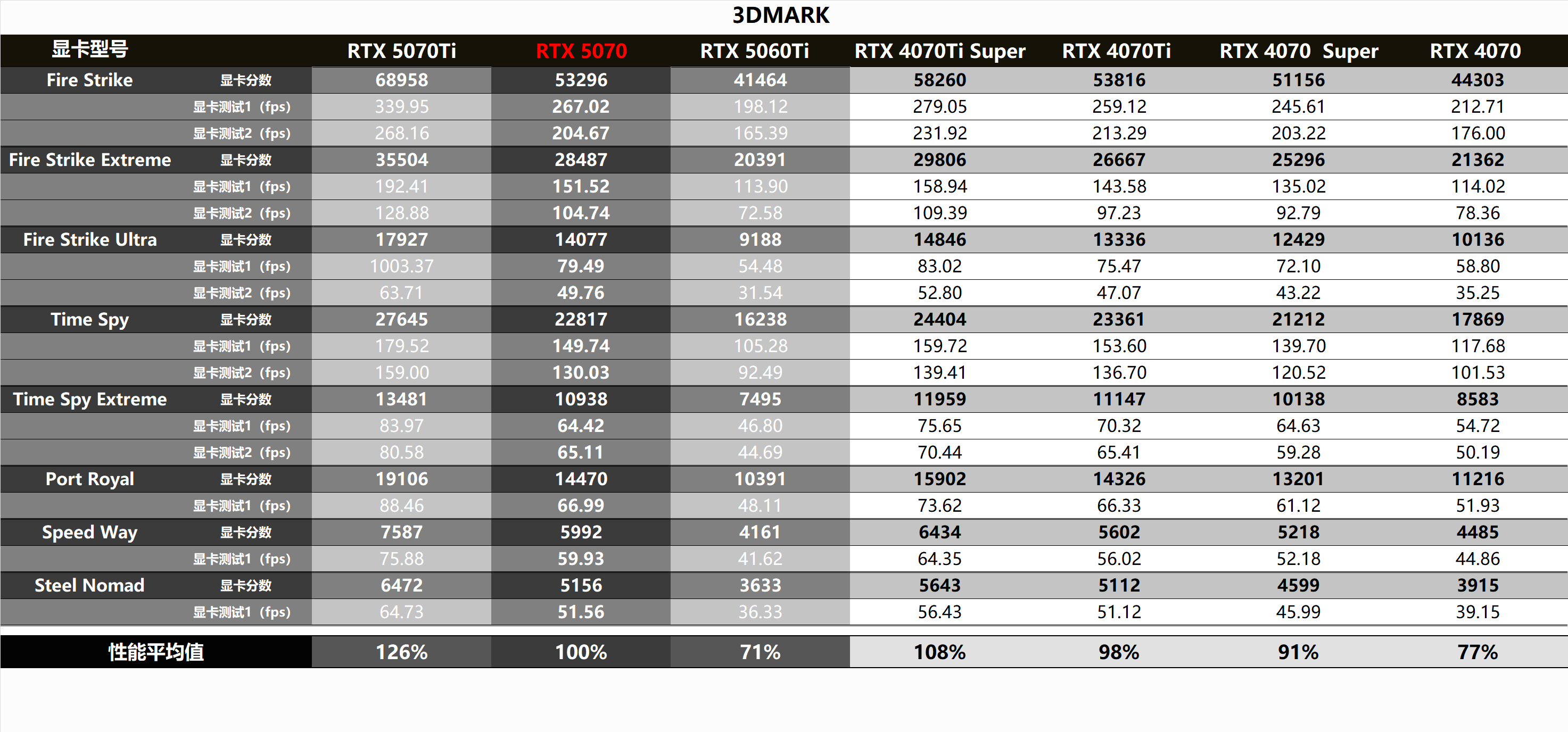 ▼3DMark的8项测试平均成绩,以RTX5070领先RTX5060Ti(16GB)接近30%,落后RTX5070Ti 为26%;领先了上代RTX4070为23%,小胜RTX4070Ti,与RTX4070Ti super的差距为8%。
