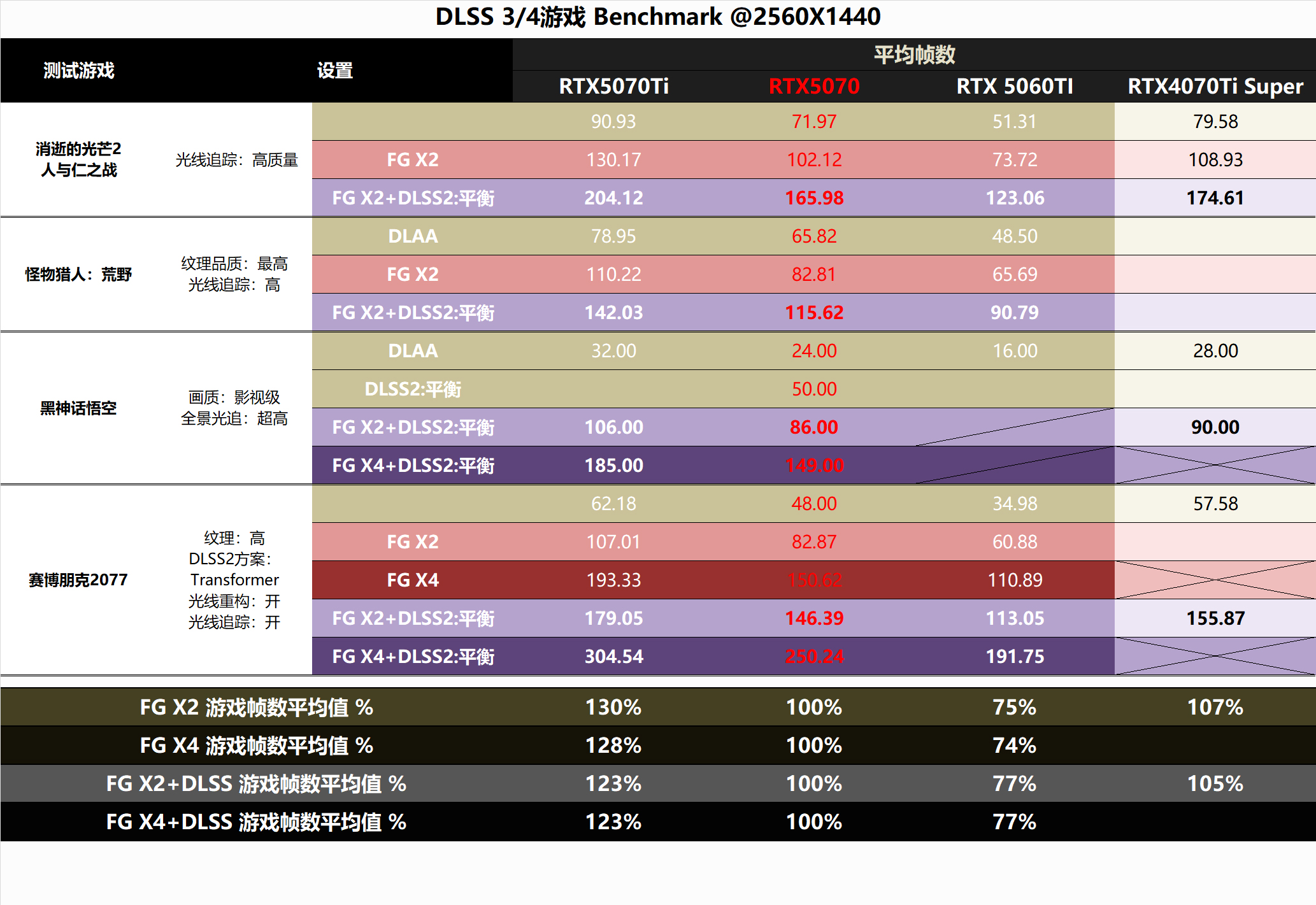 ▼帧生成(FG)有一个基础条件,就是原始帧数最好在30fps以上。在2k分辨率,RTX5070玩《黑神话:悟空》不得不先使用DLSS2达到比较高的帧数,再使用FG得到更流畅的体验。其它3款游戏则可以单独使用FG提升帧数。还是由于DLSS2在较低分辨率对平台的依赖性,如果是DLSS2+FG的模式,RTX5070Ti 和RTX5070的差距变小了一些。
