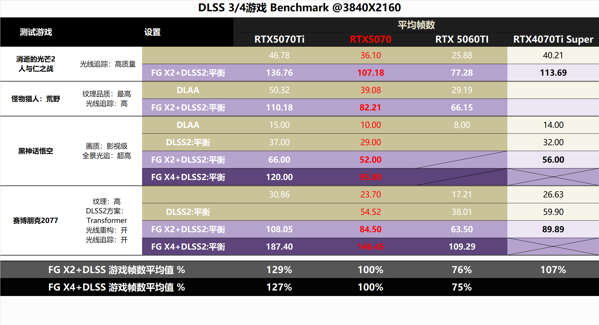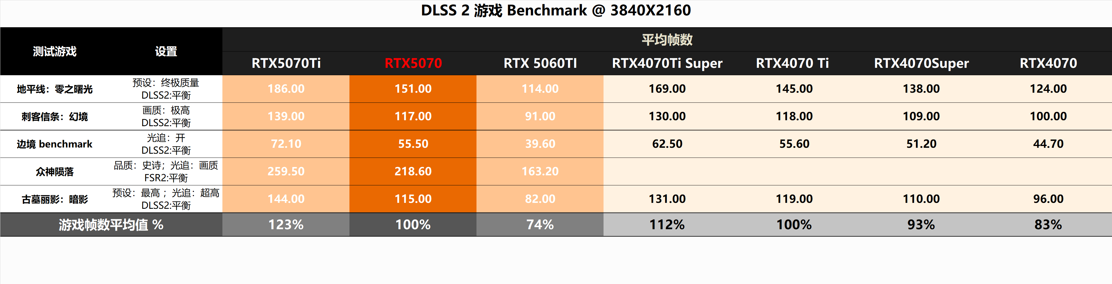 ▼在2k分辨率下,RTX5070领先RTX5060Ti(16GB)为21%,落后RTX5070Ti 为16%;领先RTX4070为17%,小胜RTX4070Ti,落后RTX4070Ti super达8%。DLSS 2也是很依赖平台性能的,作为对比组中最强的RTX5070Ti 在2K分辨率下受影响最大。