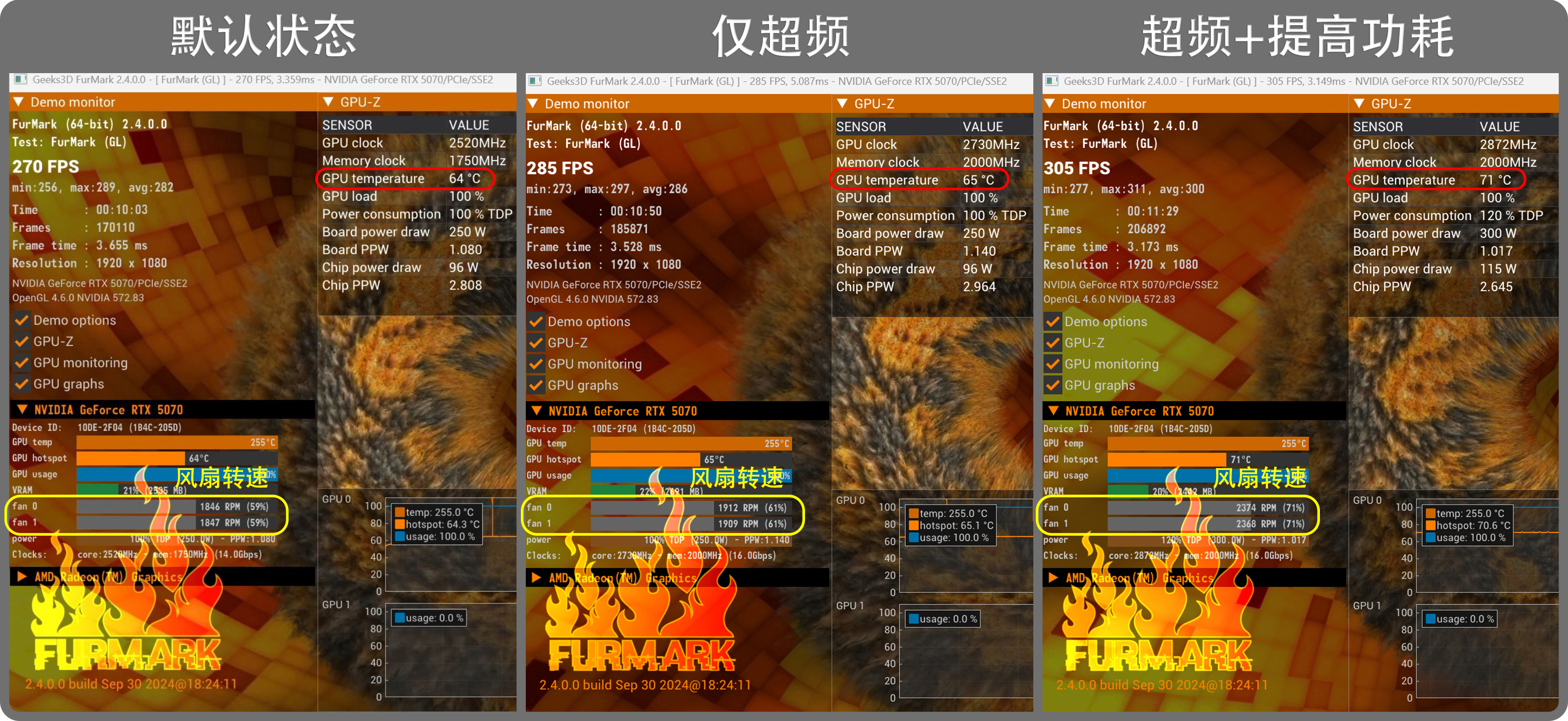 ▼Furmark烤机测试,参数设定为1080p分辨率、0AA,10分钟后,默认状态下温度为64℃;仅超频率温度为65℃,风扇转速小幅提升;超频+提高功耗,温度为71℃。风扇转速提升也较为明显,但即使这样温度也是在可以接受的范围内,魔刃的散热性能还是可以的。
