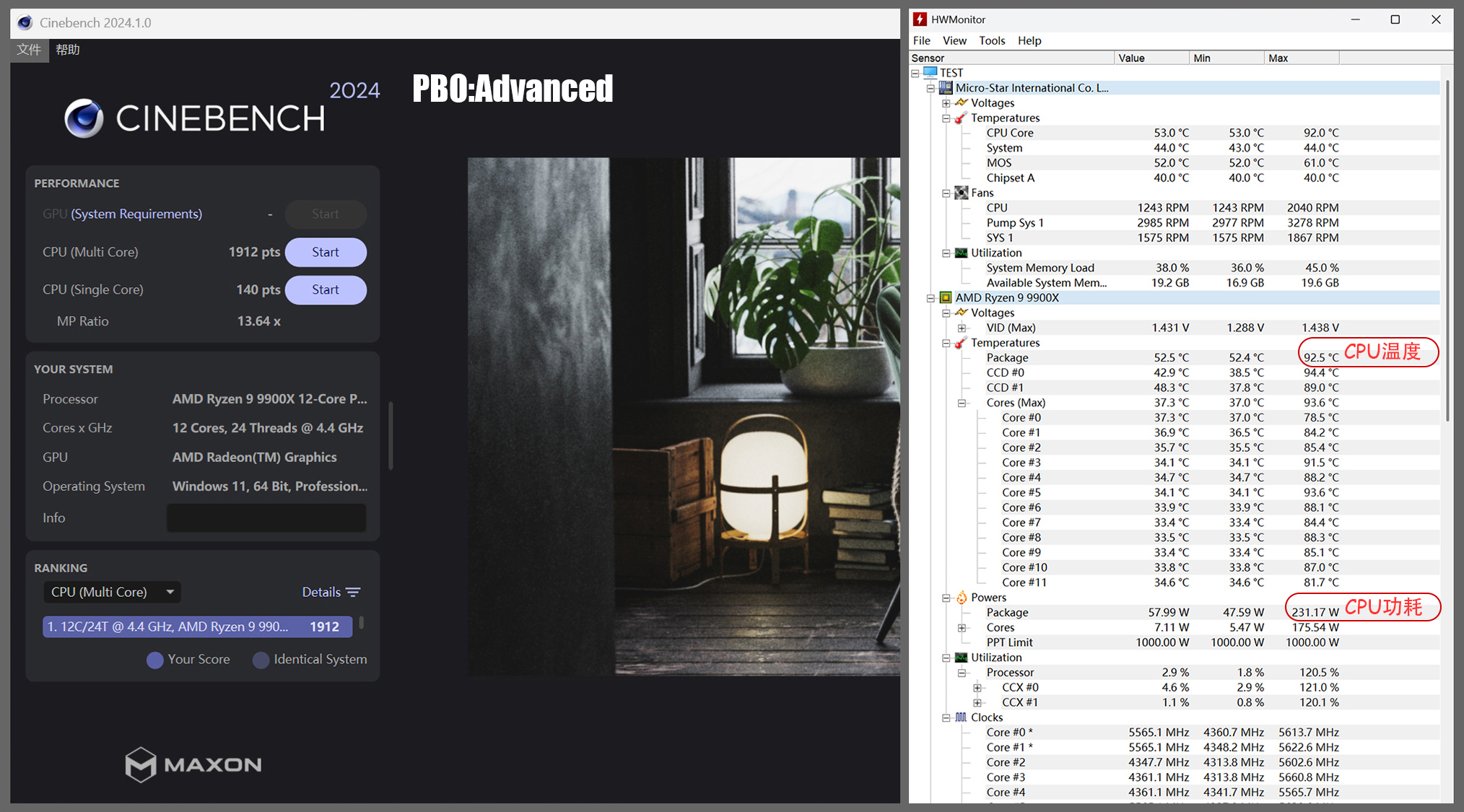 ▼PBO Advanced,频率提升到最高,不设置温度墙(默认为95°C)。CPU最高温度是~92.5°C,功耗达到了230w。多核得分为1912。相比PBO Auto,温度增加了20°C,功耗增加了40%,跑分只增加了7%.