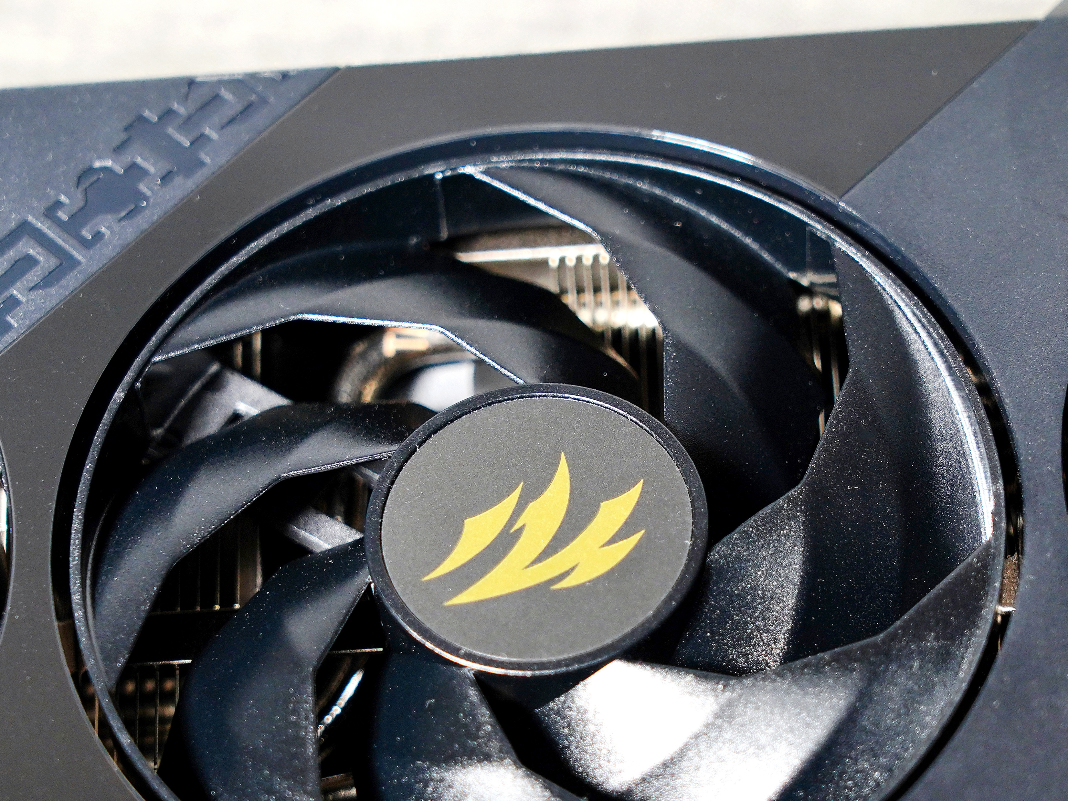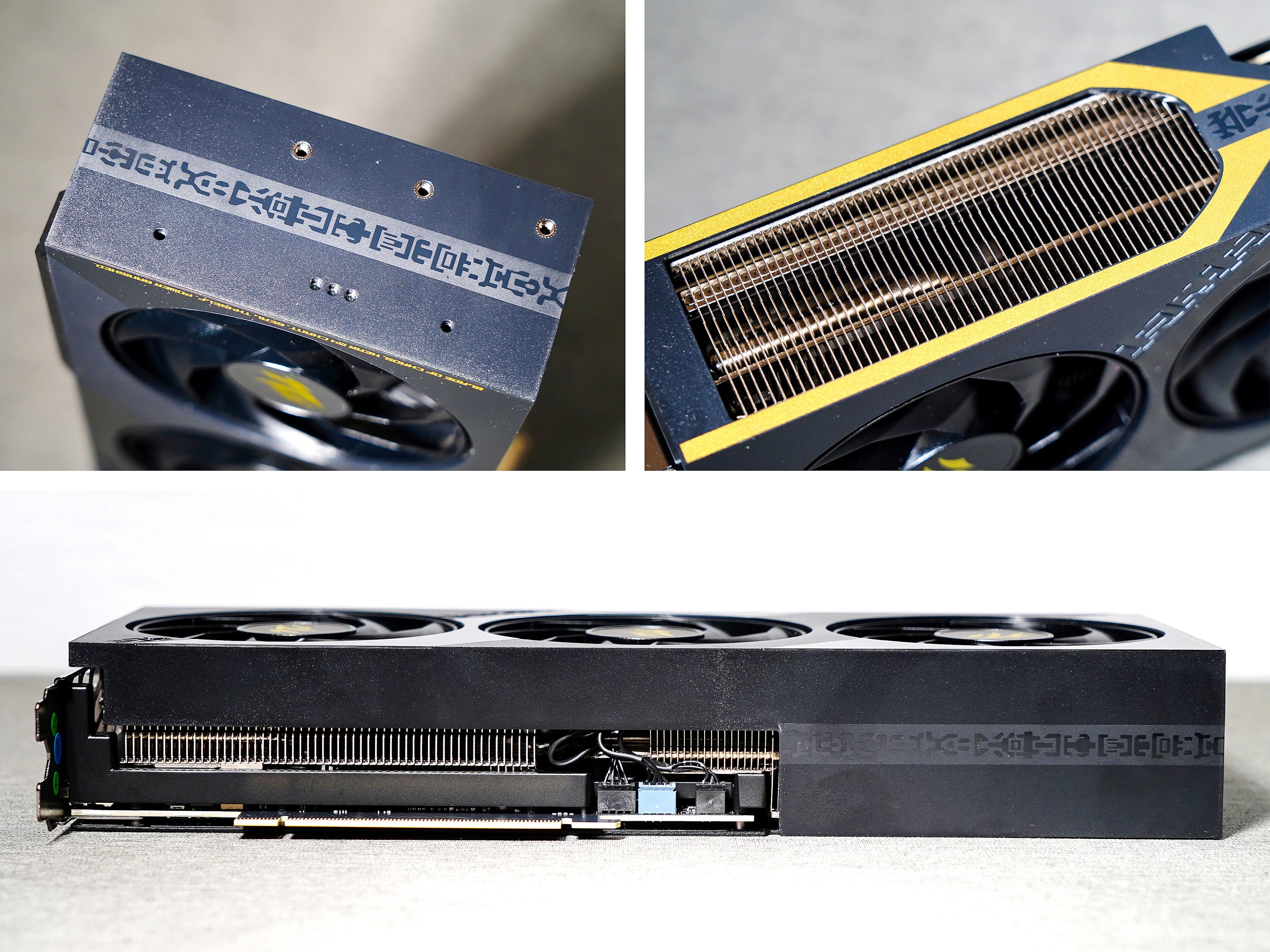 ▼显卡的风扇外罩方方正正,采用了哑光磨砂和亮面两种黑色质感的表面,再加上一些神秘的符文作为装饰。整体尺寸为:304mmX125X50mm(不含挡板)。