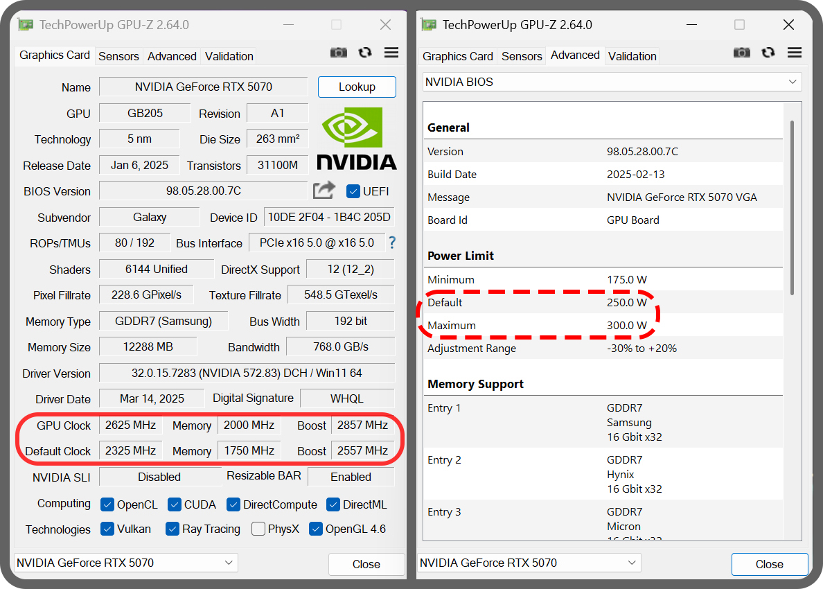 ▼RTX5070 魔刃OC,Boos频率为2557MHz,比公版要高一些。超频使用非常安全的软超,不动电压,经过摸索,核心频率拉高300MHz,显存频率拉高2000MHz。功耗也可以从250w提高到300w,当然不提高功耗,超频效果也不会太差,下面会有对比测试。