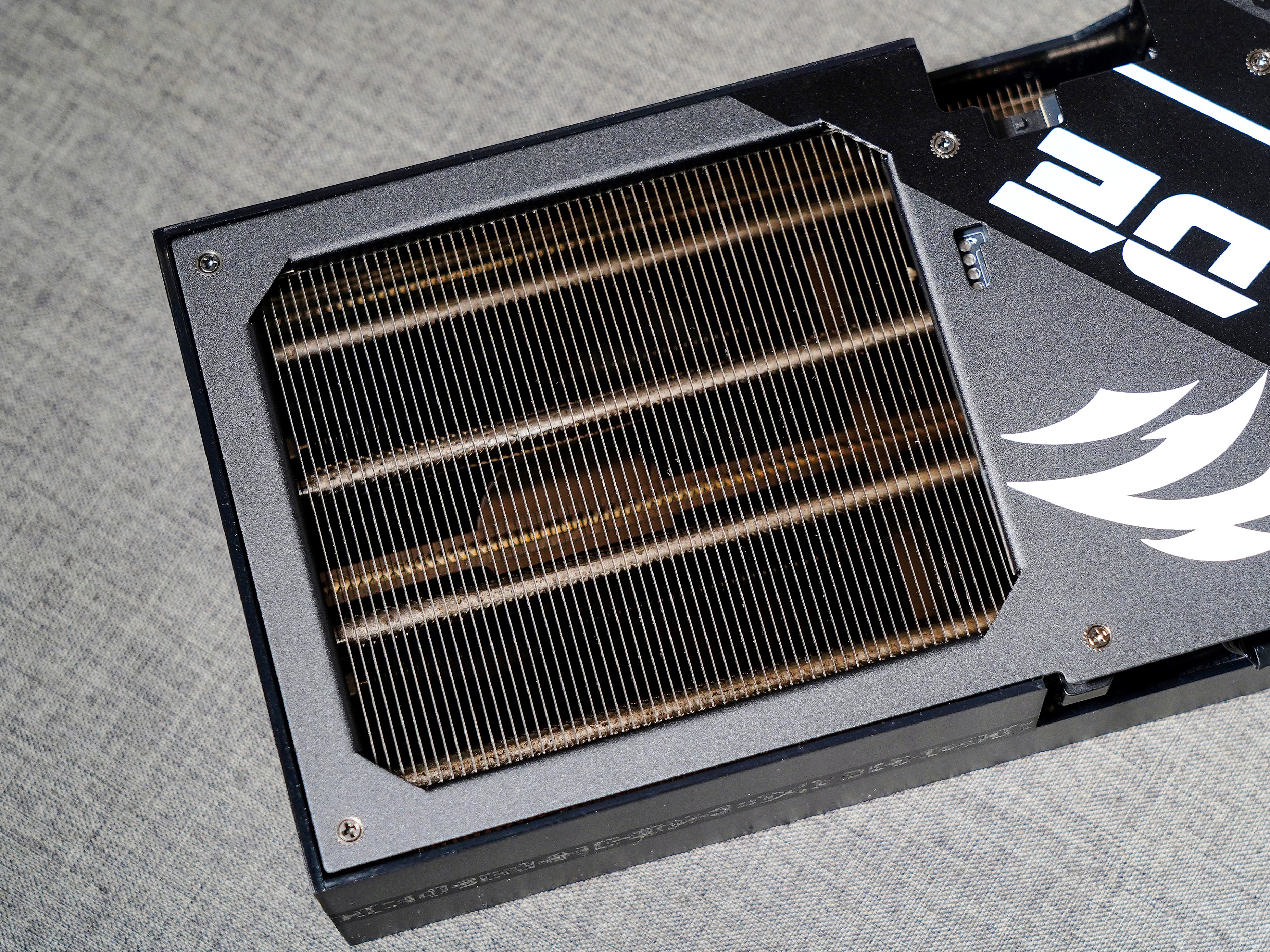 ▼磁吸灯条可以安装的另外一个地方就是显卡的前端,可以看到前端是完全封死的,两侧设计有通风口,几乎有一半以上也是封闭的。内部有4根6mm镀镍复合热管,再加上50mm的厚度,散热鳍片的规模肯定不小,保证了足够的散热性能。