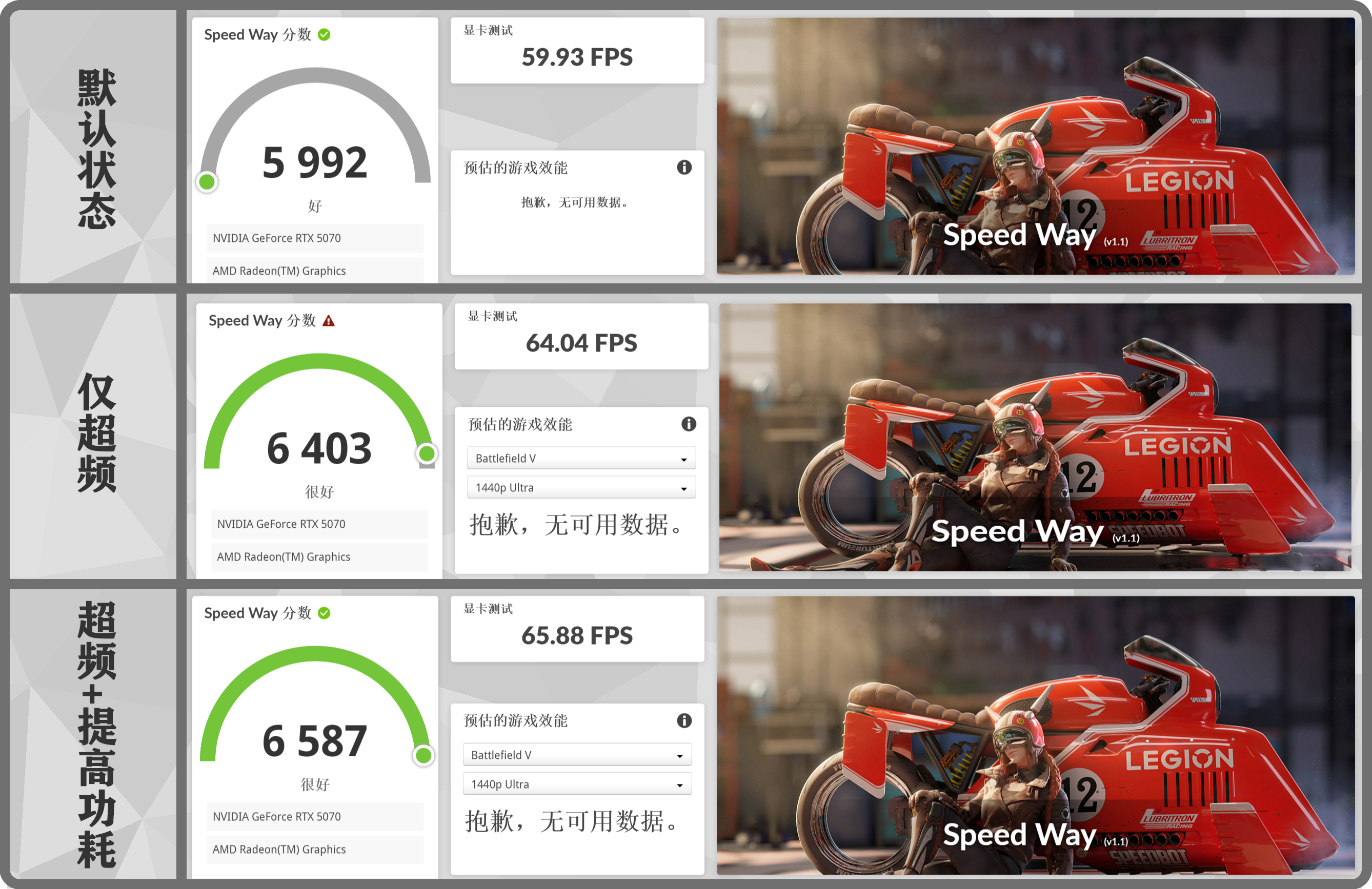 ▼ 首先使用3DMark的Speed Way,以默认状态为基准,仅超频(超核心频率和显存频率),不动功耗限制,得分从5992来到了6403,性能提高了6.8%;超频并提高功耗,得分为6587,性能提高了9.9%。