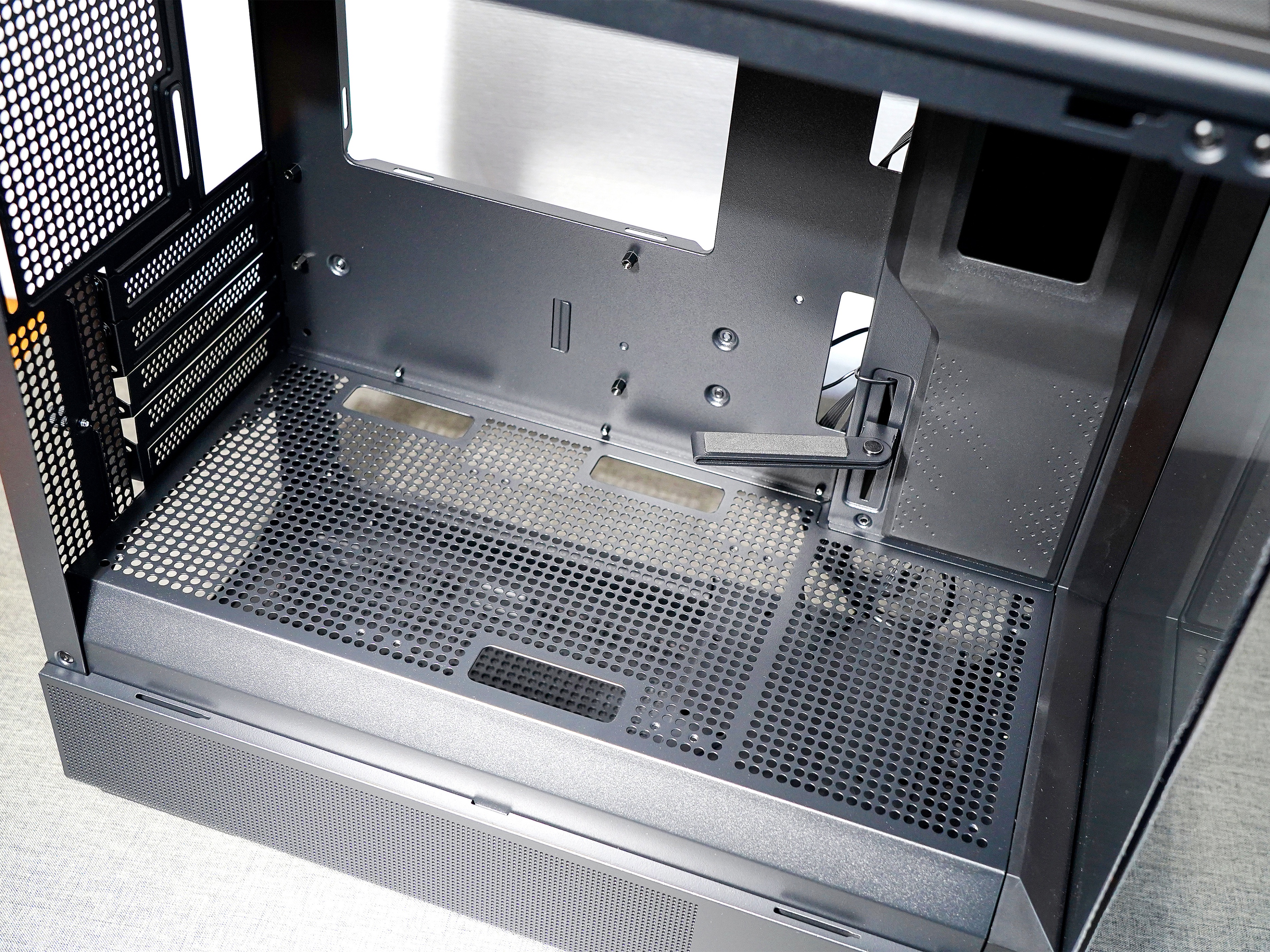 ▼电源仓两侧都有mesh网孔设计,上面安装风扇,供给显卡冷风还是很有保障的。不过这样风扇会挡住预留的显卡供电线口,线材只能从主板架上穿过来。