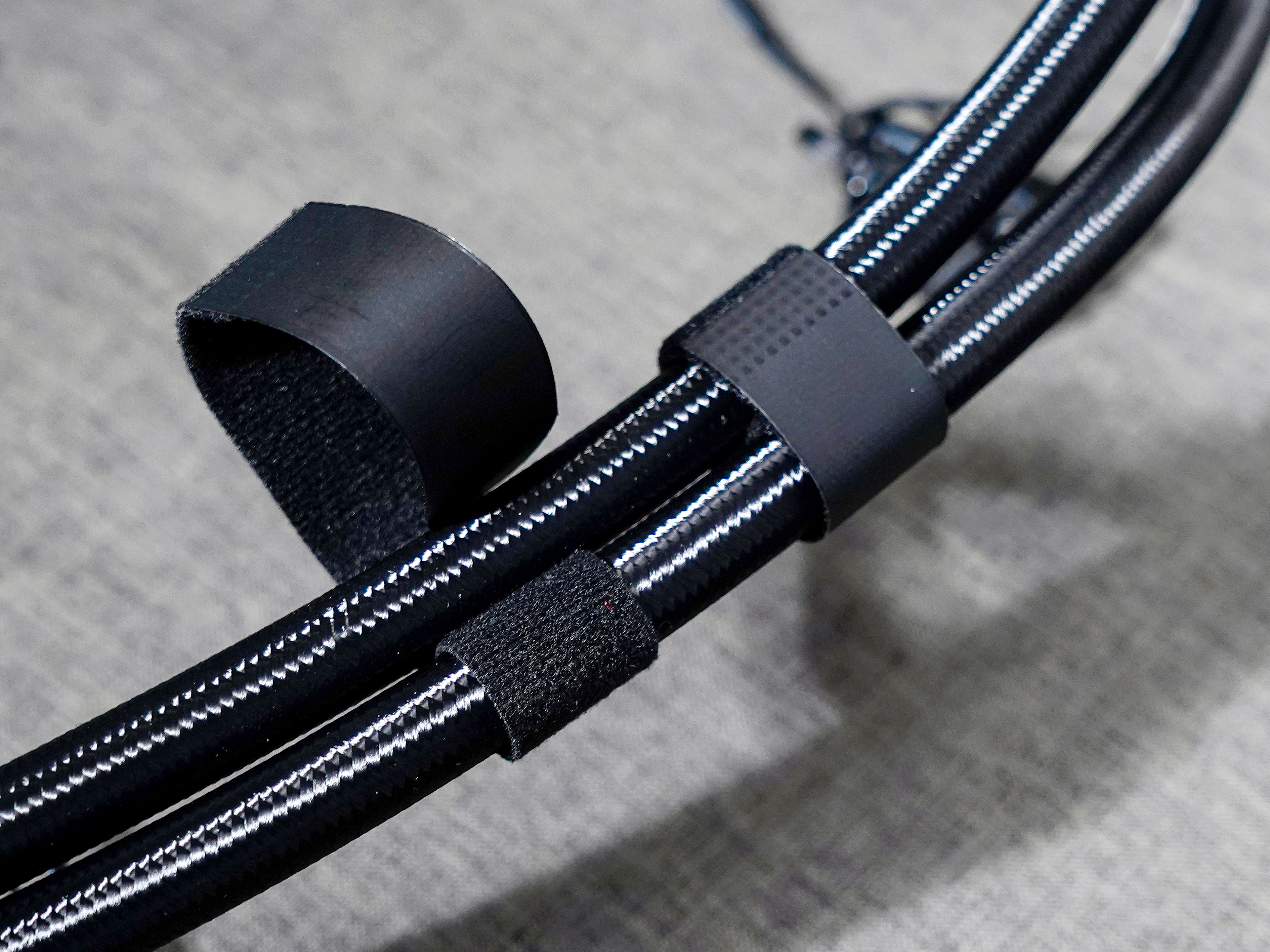 ▼水管外层有尼龙纤维编网,长度410mm,并带有2个魔术贴,方便控制水冷管走向,同时也能避免过度弯折。