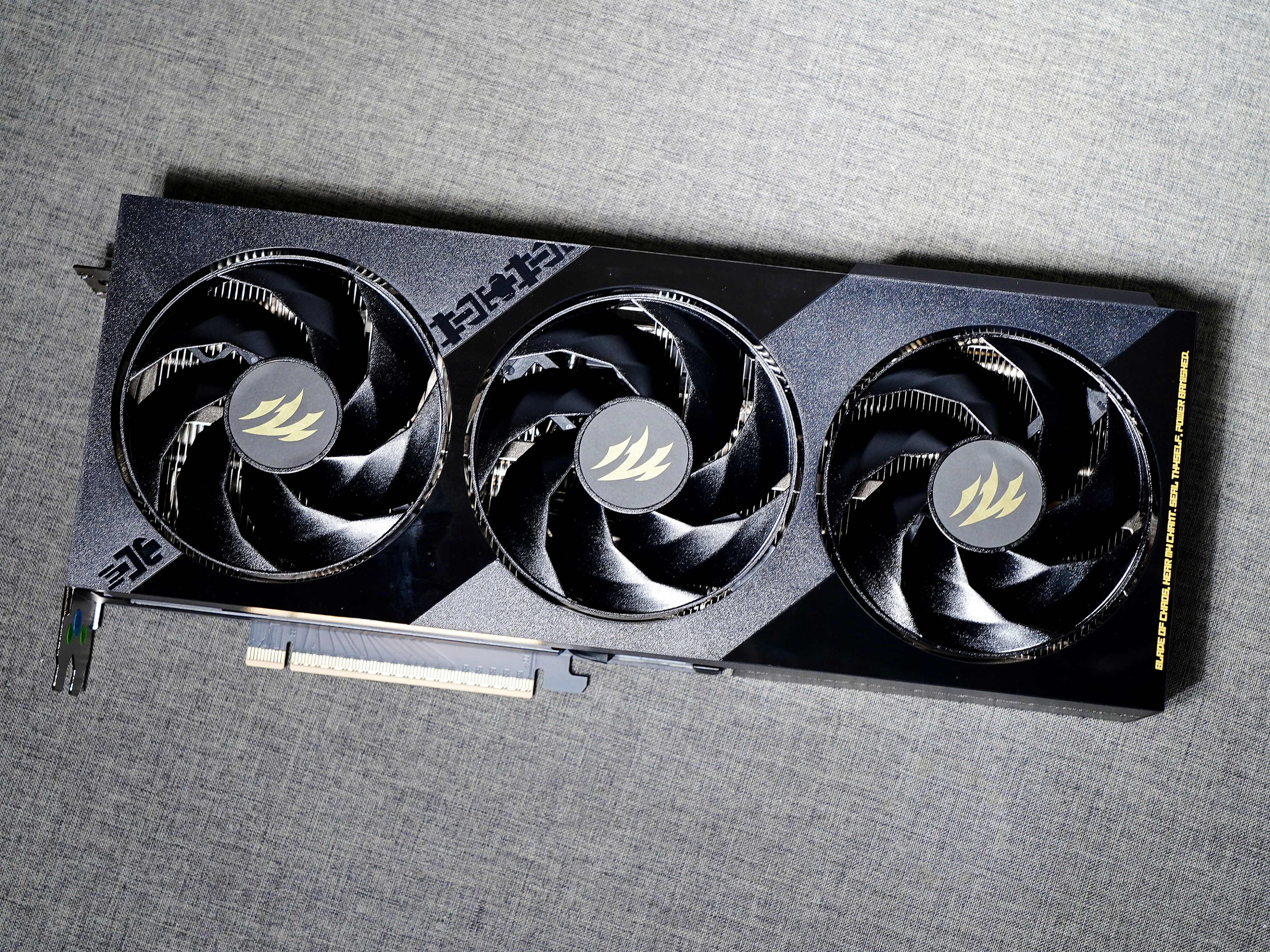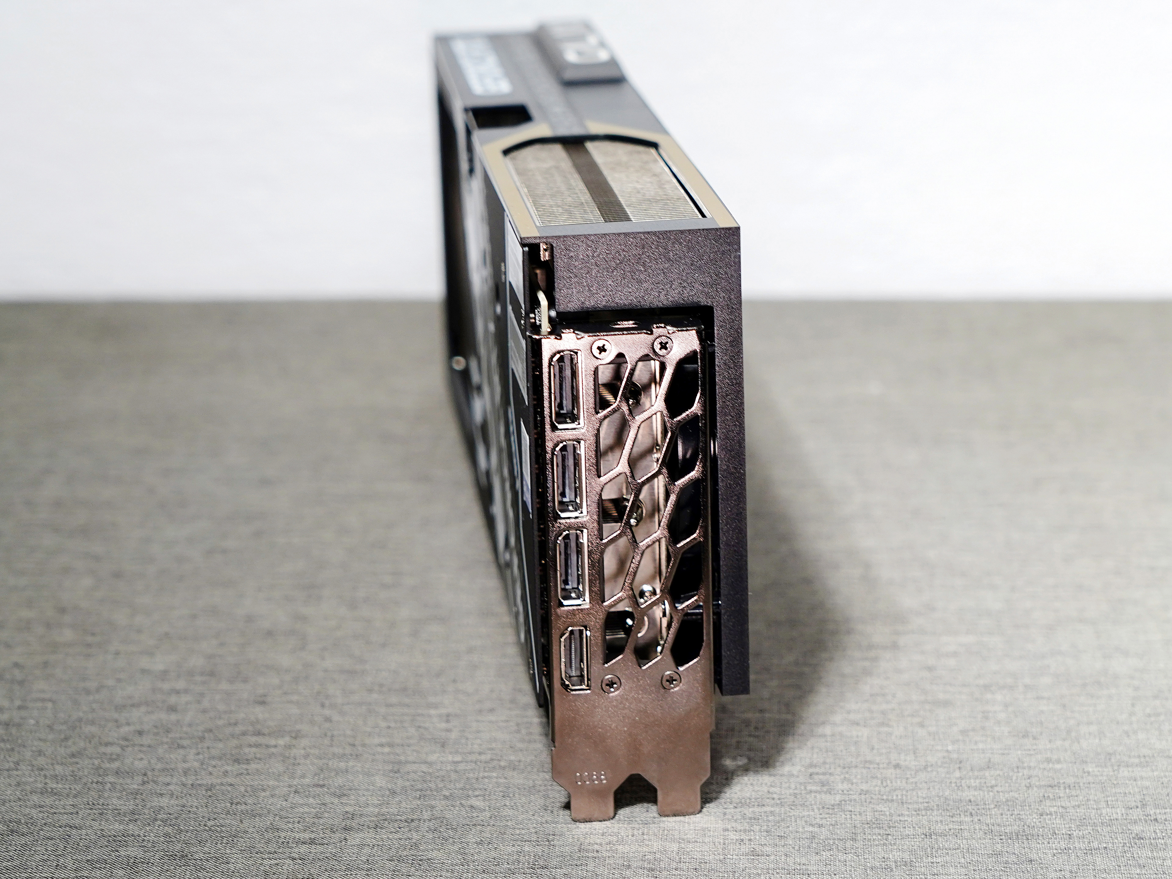 ▼接口为3个DP 2.1b和1个HDMI 2.1b接口,还可以看到这款显卡除了厚度超过了2槽,宽度也是略微越肩的。