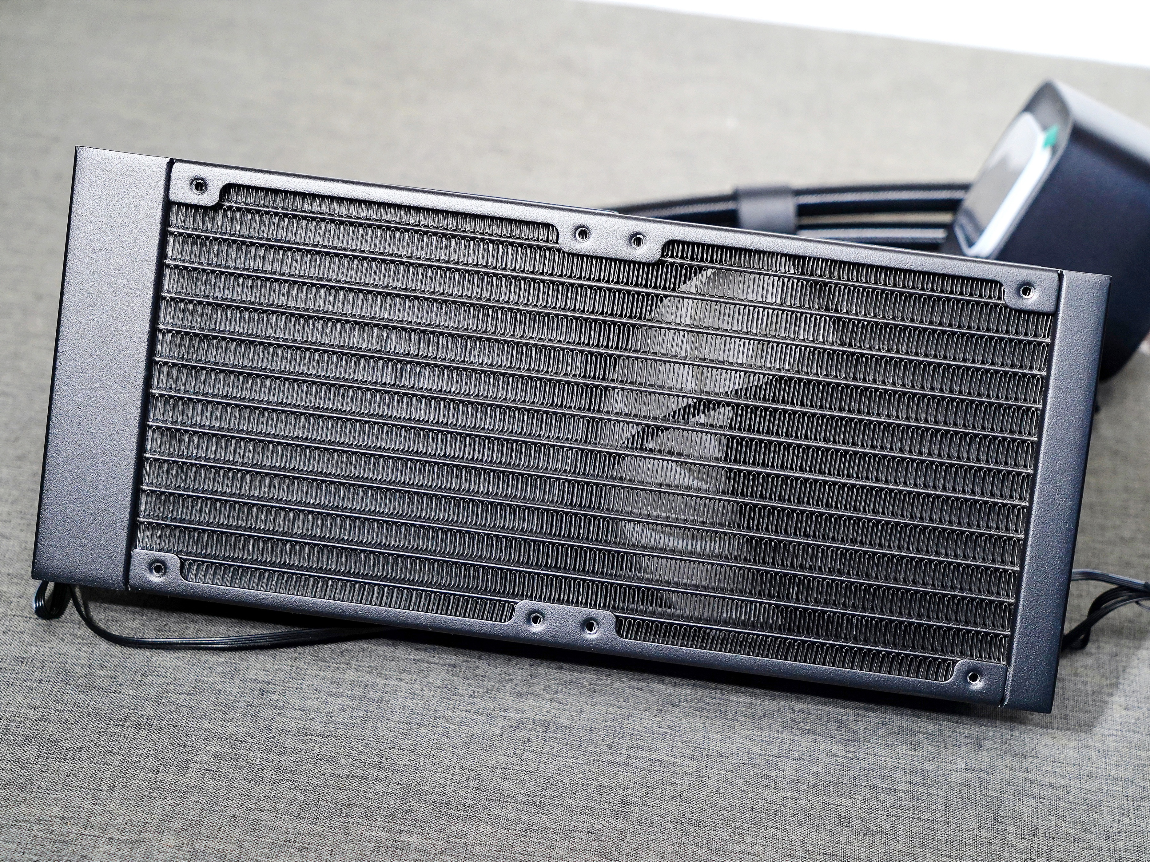 ▼冷排为12条水道设计,27mm厚度,鳍片做工扎实。