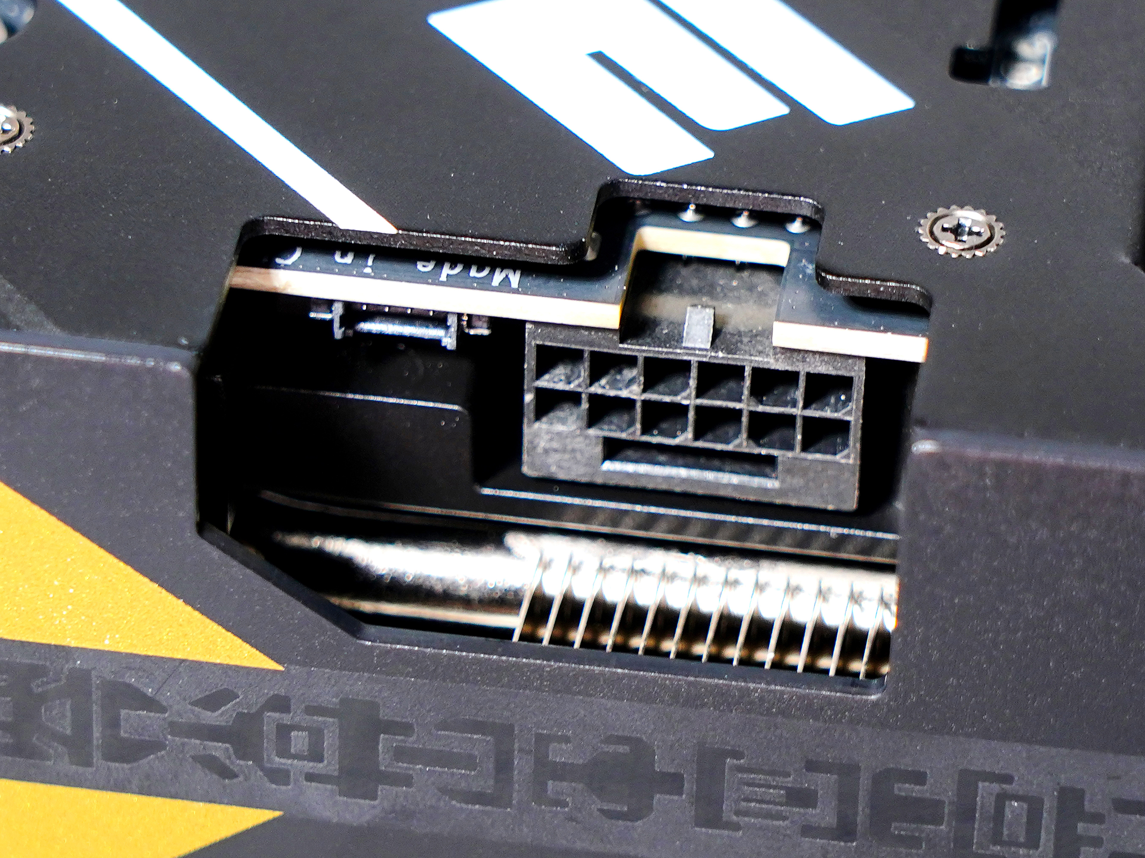 ▼外侧中间部分有12V-2×6电源接口,旁边还有一个5V的ARGB接口,通过转接线连接主板后,可由主板灯控软件管理显卡灯效,同步主机整体的光效。