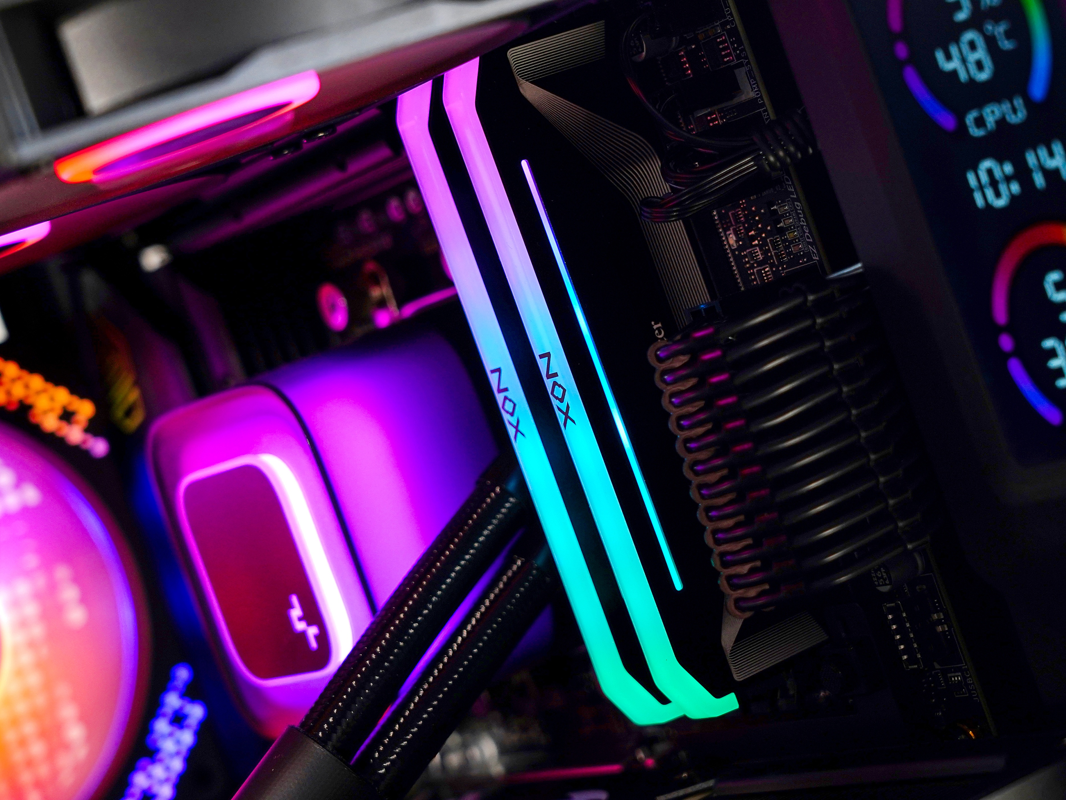 ▼内存顶部为大面积的白色导光条,中间位置有NOX标识,点亮后具有广角漫射灯效,并支持各大板厂ARGB灯控。