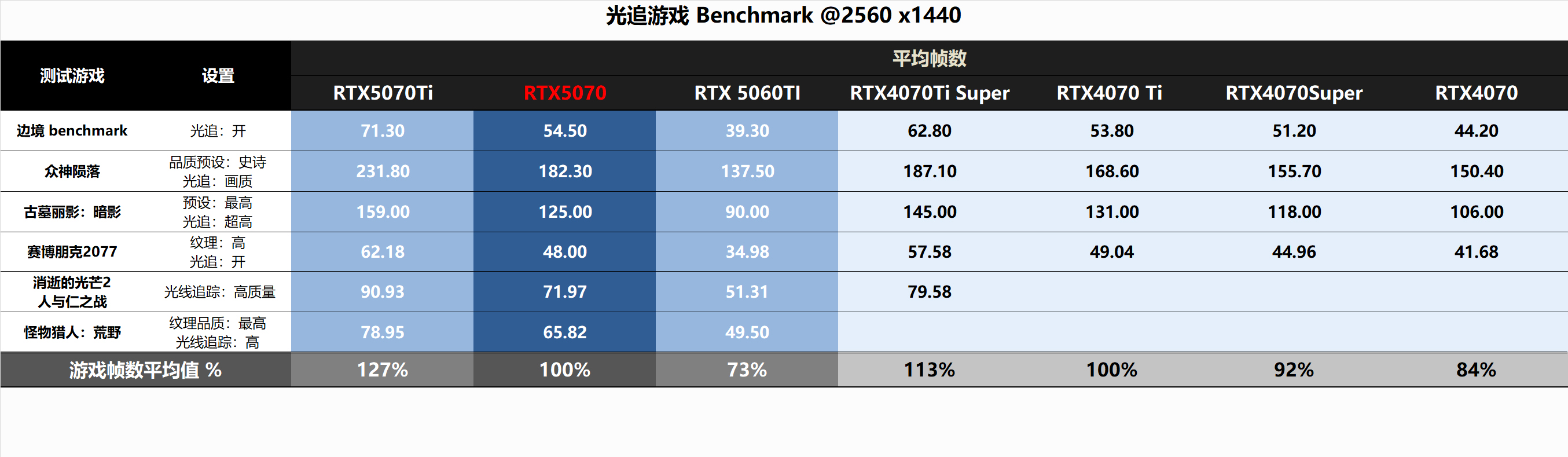 ▼打开光追,2k分辨率下,RTX5070领先RTX5060Ti(16GB)为27%,落后RTX5070Ti 为27%;领先RTX4070为16%,打平RTX4070Ti,落后RTX4070Ti super达13%。