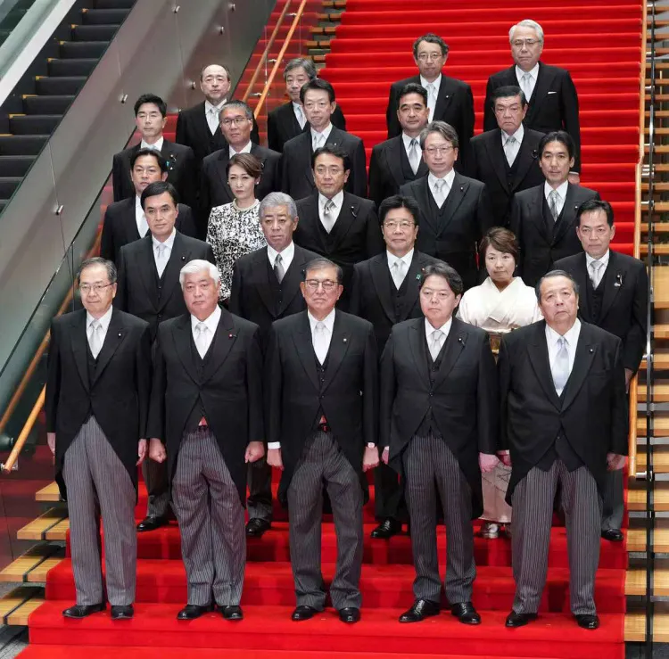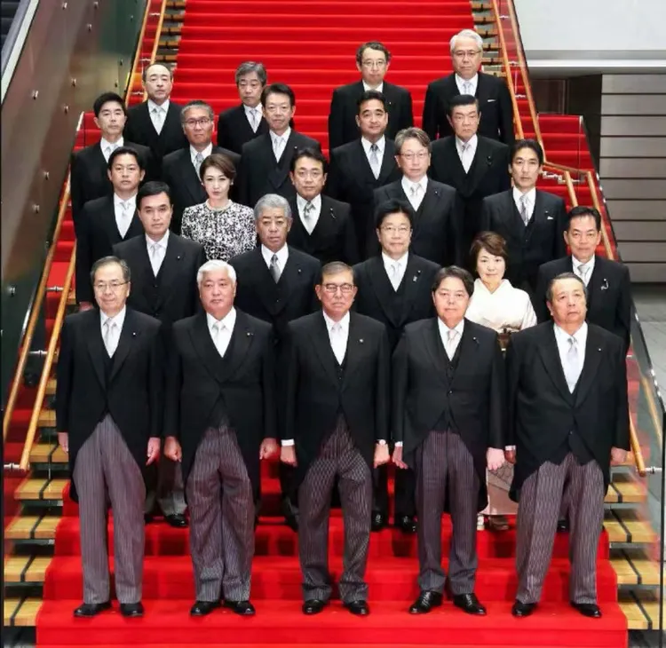 实际上,石破茂在上任后,内阁在首相官邸合影时,就被日本民众嫌弃有失礼仪,比如石破茂和当时的防卫部长中谷元的腹部可见到白色衬衫,整张照片和拉胯,都没有精修。后续才进行修图P掉。