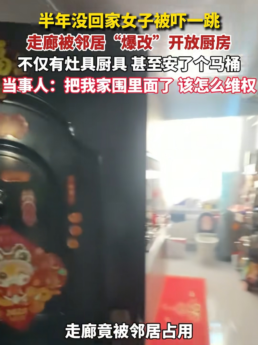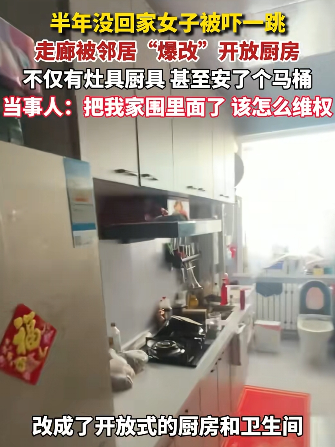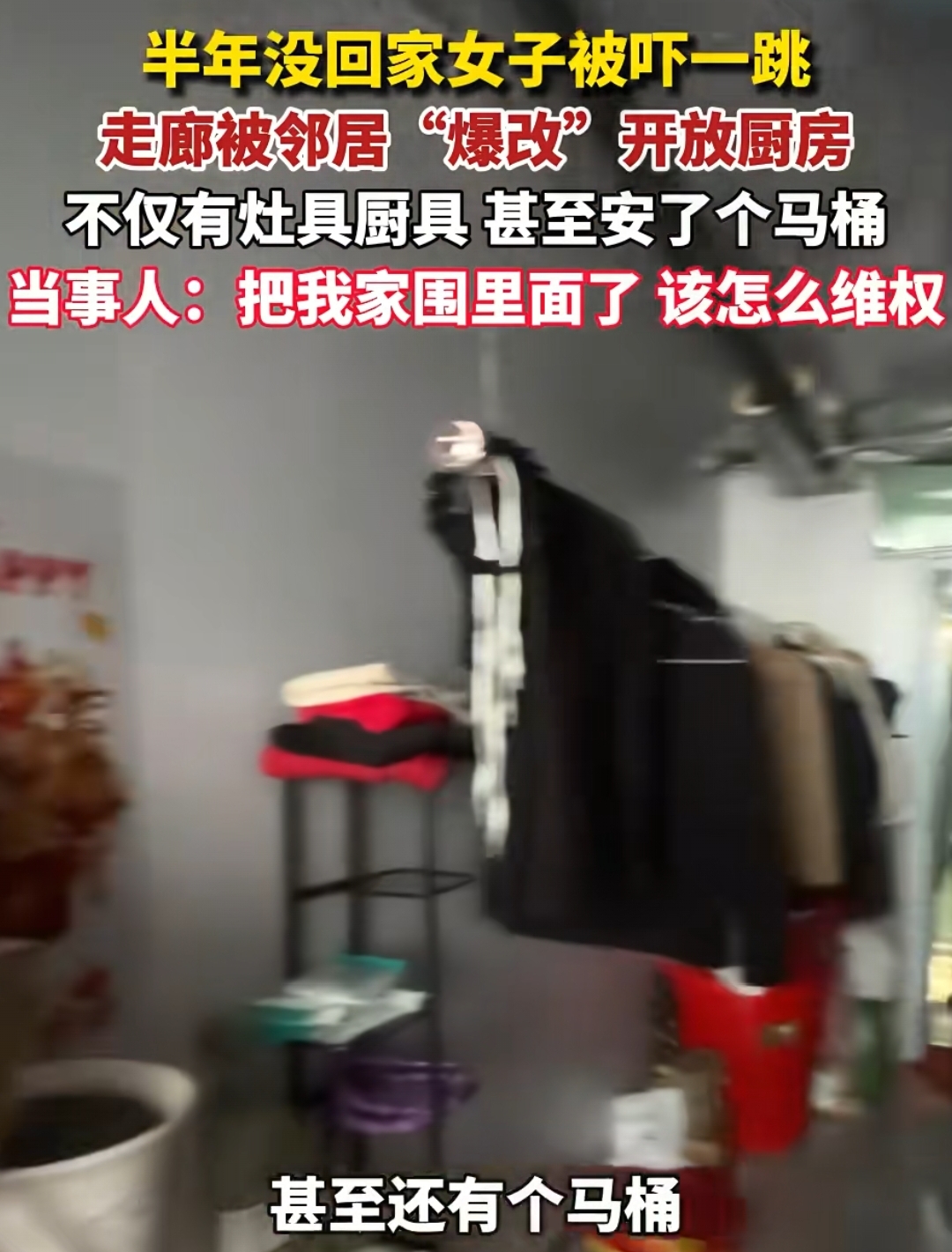 一女子半年没回自己家,回家后一开门差点被气晕过去!公共走廊竟然被邻居给改成了开放式厨房加厕所,灶台对着家门,马桶就在过道中间,想进自己屋,还得先找邻居拿钥匙!
