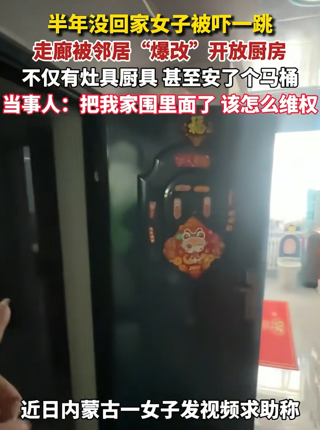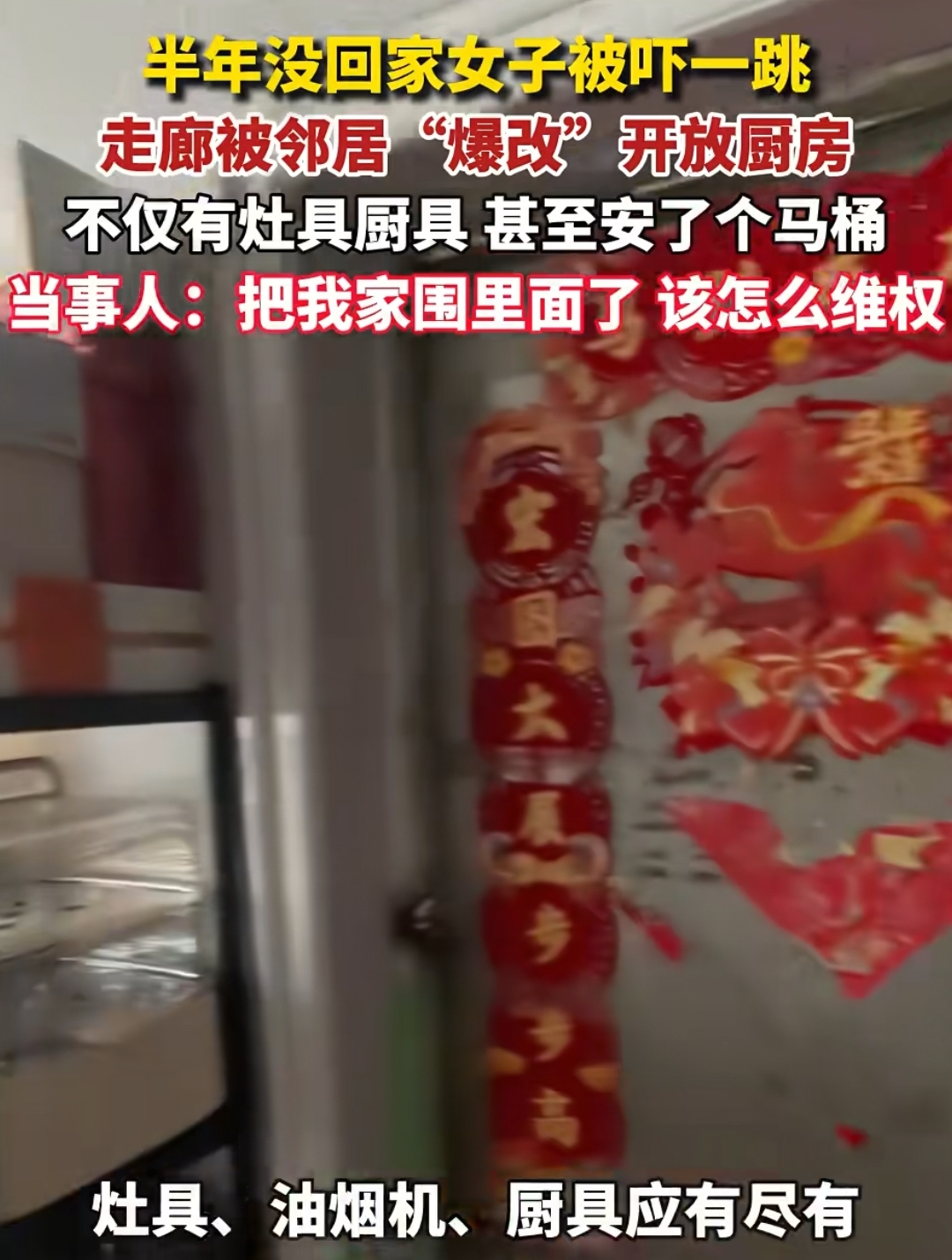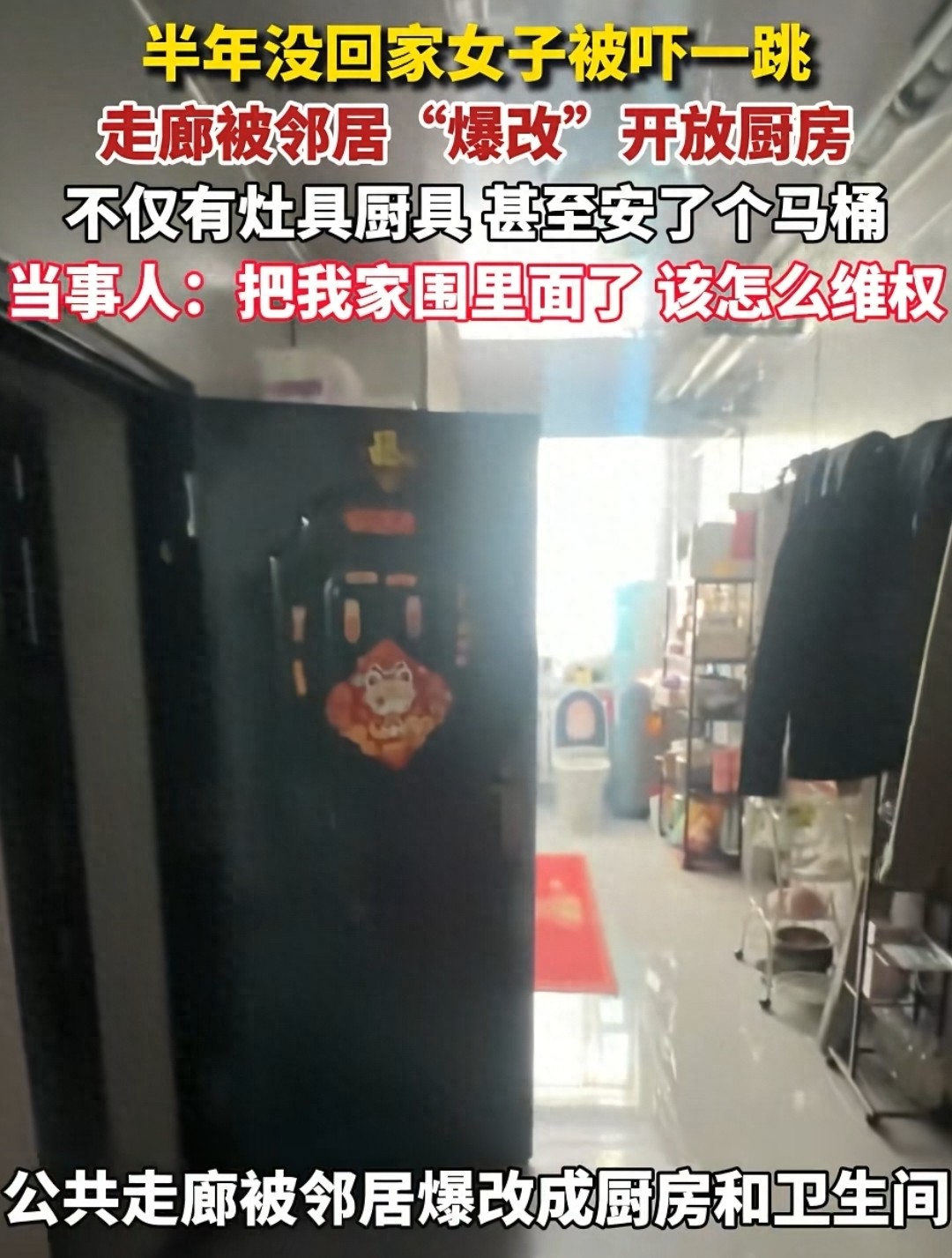 一女子半年没回自己家,回家后一开门差点被气晕过去!公共走廊竟然被邻居给改成了开放式厨房加厕所,灶台对着家门,马桶就在过道中间,想进自己屋,还得先找邻居拿钥匙!