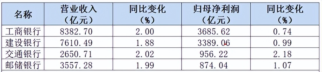 近日,工商银行、建设银行、交通银行、邮储银行均发布了其2025年年报,其中,工商银行、建设银行、交通银行、邮储银行均实现了营业收入与归母净利润的双增长。工商银行、建设银行、交通银行、邮储银行的营收增速均接近2%,相差不大。但是说到归母净利润增长率,差距就出来了,交通银行归母净利润增速超过2%,达2.18%;其他三家均在1%左右。