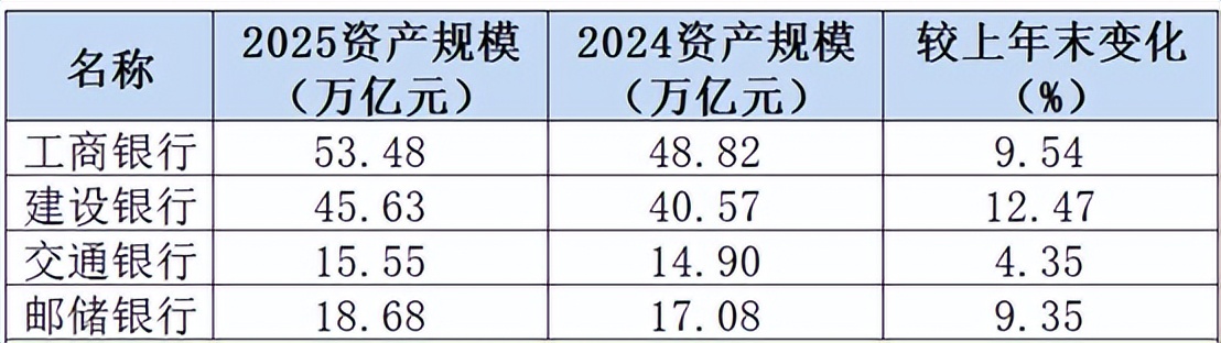 从资产规模看,四大行均有比较明显的增长。其中,截至2025年末,工行总资产达53.48万亿元,真是富可敌国啊。