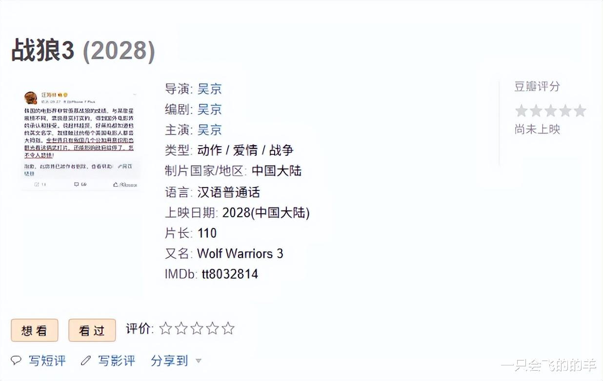在豆瓣网站上,写的是战狼3预计上映日期为2028年。我认为希望非常渺茫,战狼3很大概率是与观众遥遥无期了。